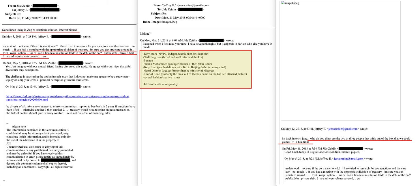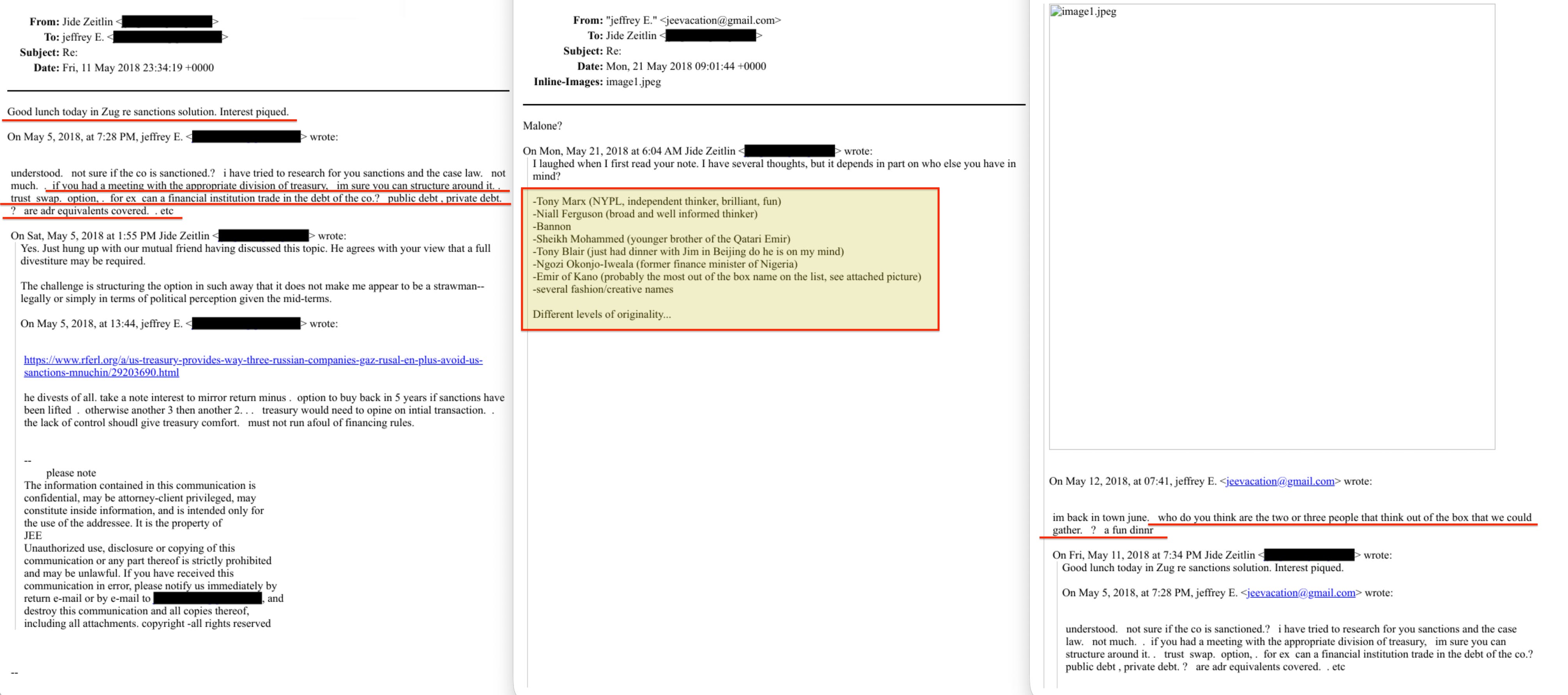 The architecture had applications beyond programmable money. In May 2018, Jide Zeitlin — a former Goldman Sachs partner in Epstein's circle75 — reported to Epstein: ‘Good lunch today in Zug re sanctions solution. Interest piqued’76. Zug is the Swiss canton known as Crypto Valley — the global centre of blockchain corporate infrastructure77. Epstein had been advising Zeitlin on sanctions structuring: ‘if you had a meeting with the appropriate division of treasury, im sure you can structure around it.. trust swap. option’.