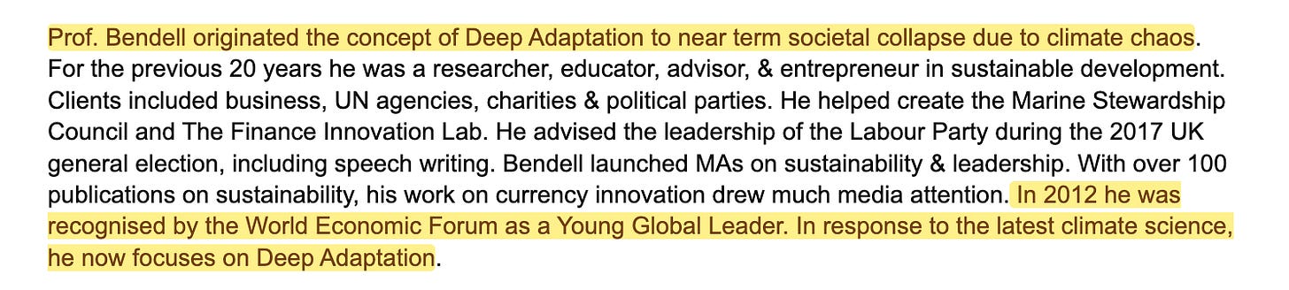 In 2018, the same Institute published Bendell’s ‘Deep Adaptation’86 arguing that climate-induced societal collapse is now inevitable and that existing sustainability tools have failed. The ethical framework commissioned in 2012 to justify the architecture became, six years later, the crisis narrative that makes its emergency implementation urgent.