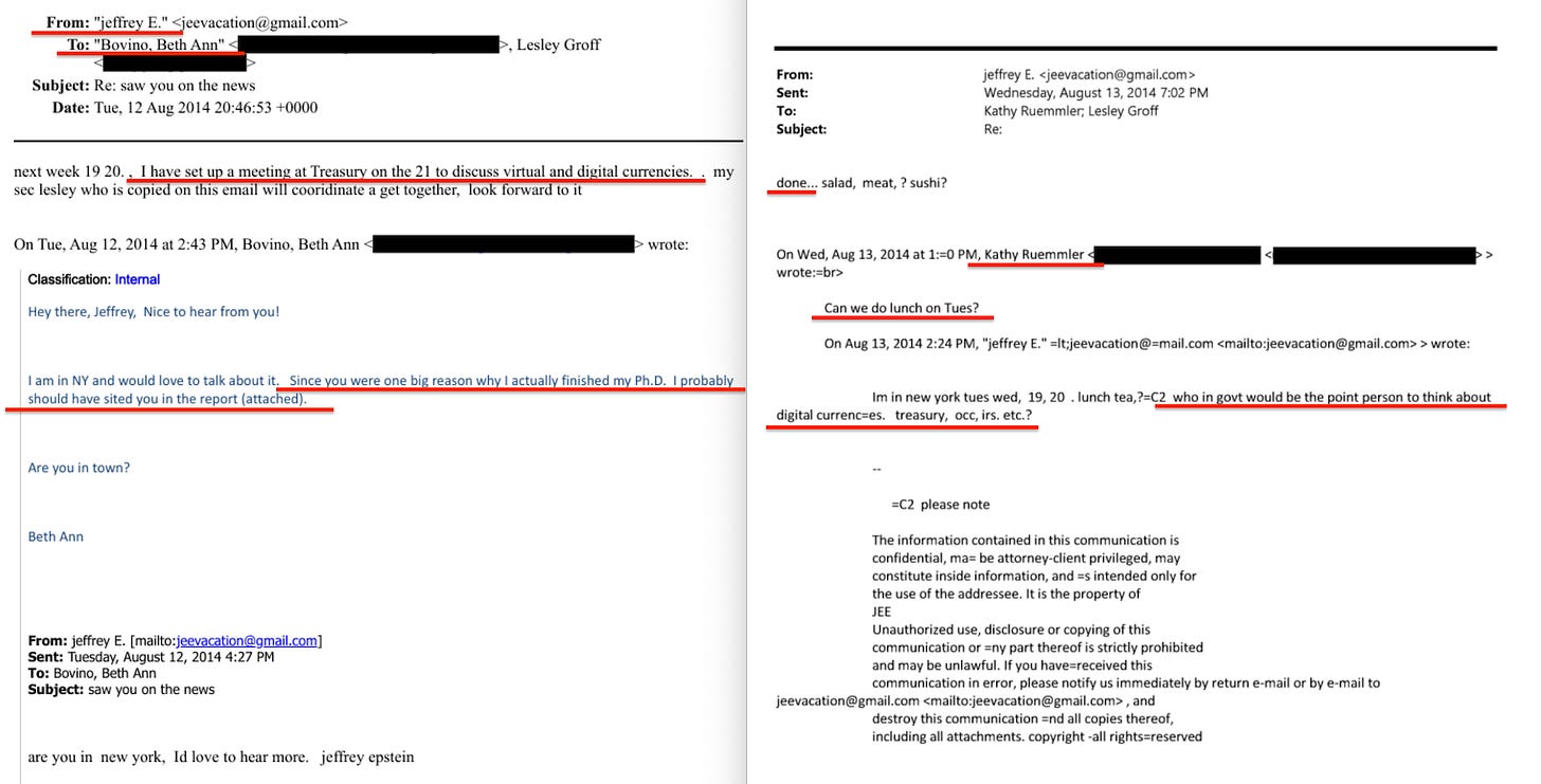 On 12 August 2014, Epstein told Beth Ann Bovino — an economist whose PhD he had funded, now chief US economist at S&P Global — that he had ‘set up a meeting at Treasury on the 21 to discuss virtual and digital currencies’44. The next day, he emailed Kathryn Ruemmler — Obama’s White House Counsel until three months earlier — asking ‘who in govt would be the point person to think about digital currencies. treasury, occ, irs, etc.?’45 Ruemmler replied: ‘Can we do lunch on Tues?’.