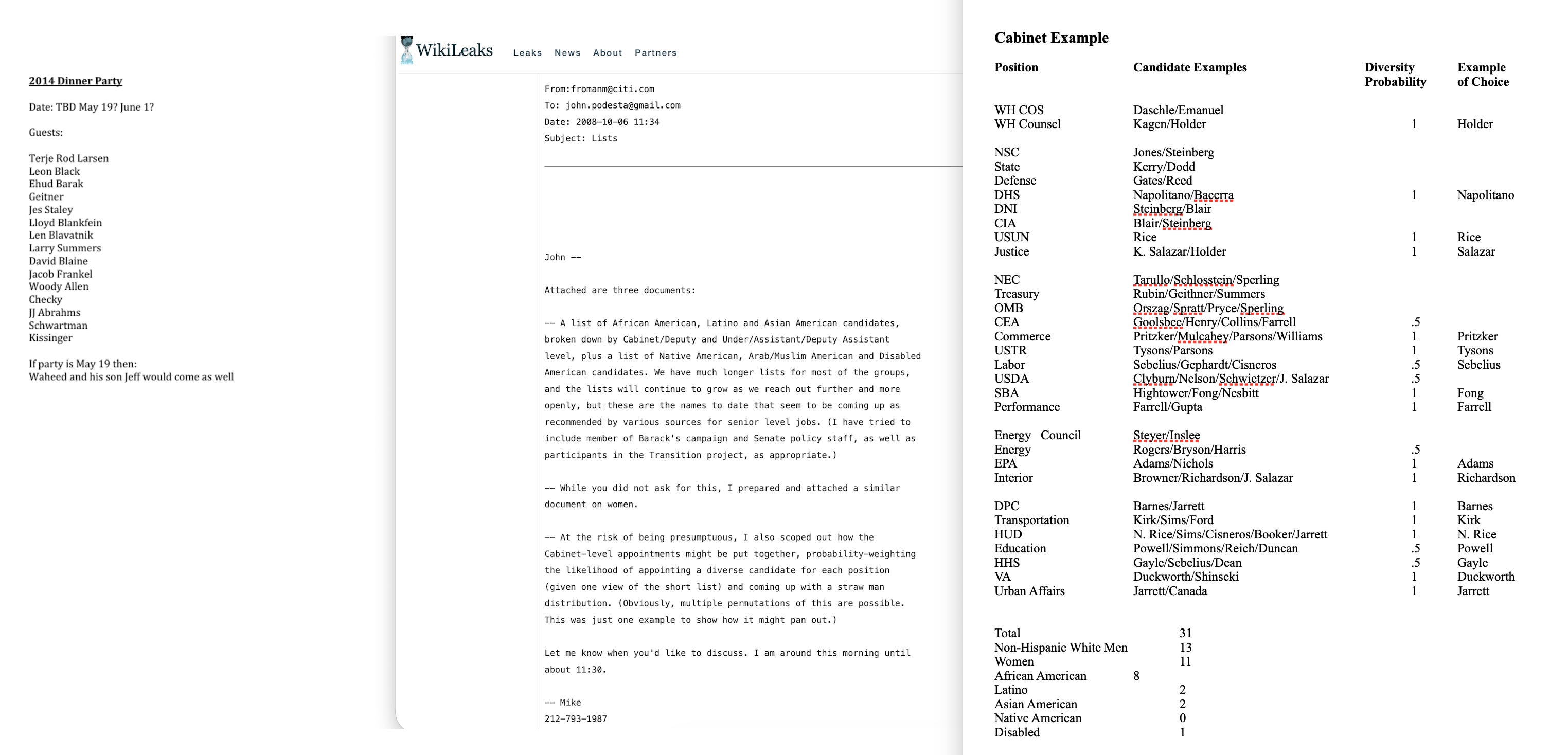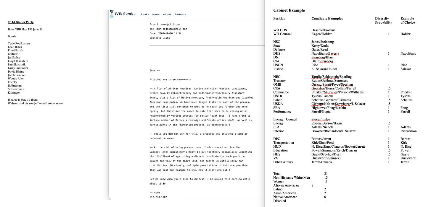 A month before Obama’s election in October 2008, Michael Froman at Citigroup emailed John Podesta with a cabinet list that included Robert Rubin, Larry Summers, and Timothy Geithner for Treasury107108.