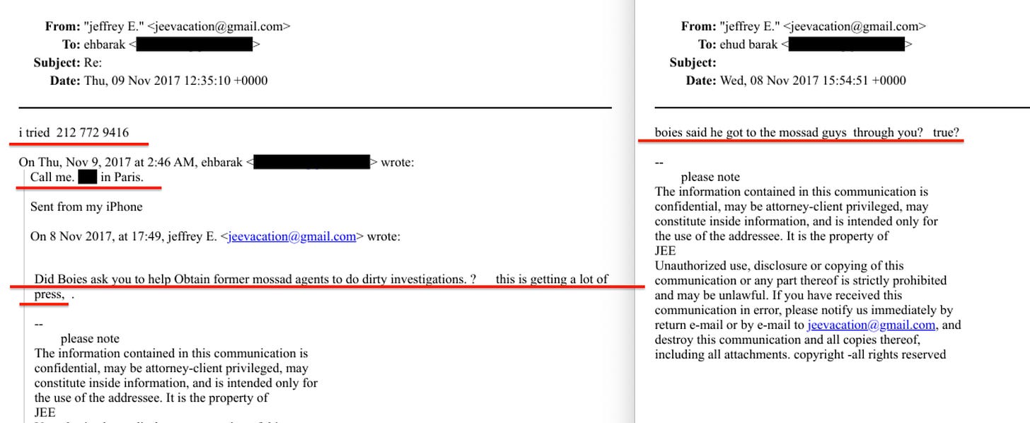 On November 8, 2017, Epstein sent Barak two emails within two hours. At 3:54 PM111: ‘boies said he got to the mossad guys through you? true?’ At 5:49 PM, escalating112: ‘Did Boies ask you to help Obtain former mossad agents to do dirty investigations.? this is getting a lot of press’.