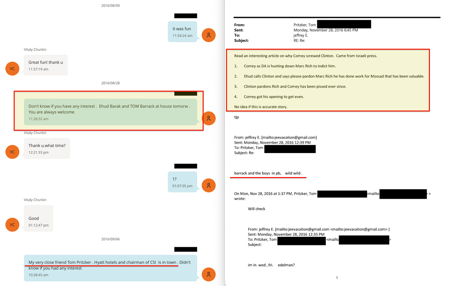 Three weeks after the election, on November 28, Epstein wrote to Tom Pritzker110 — billionaire chairman of Hyatt Hotels — ‘barrack and the boys in pb, wild wild’. Pritzker replied that evening with an article from the Israeli press explaining ‘why Comey screwed Clinton’: ‘1. Comey as DA is hunting down Marc Rich to indict him. 2. Ehud calls Clinton and says please pardon Marc Rich he has done work for Mossad that has been valuable. 3. Clinton pardons Rich and Comey has been pissed ever since. 4. Comey got his opening to get even’. Pritzker added: ‘No idea if this is accurate story’.
