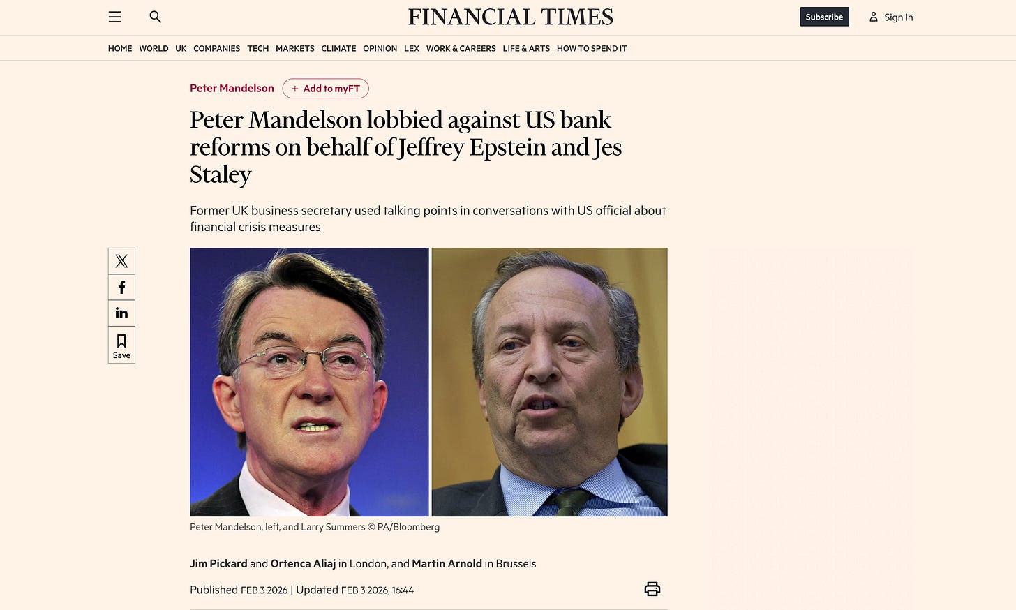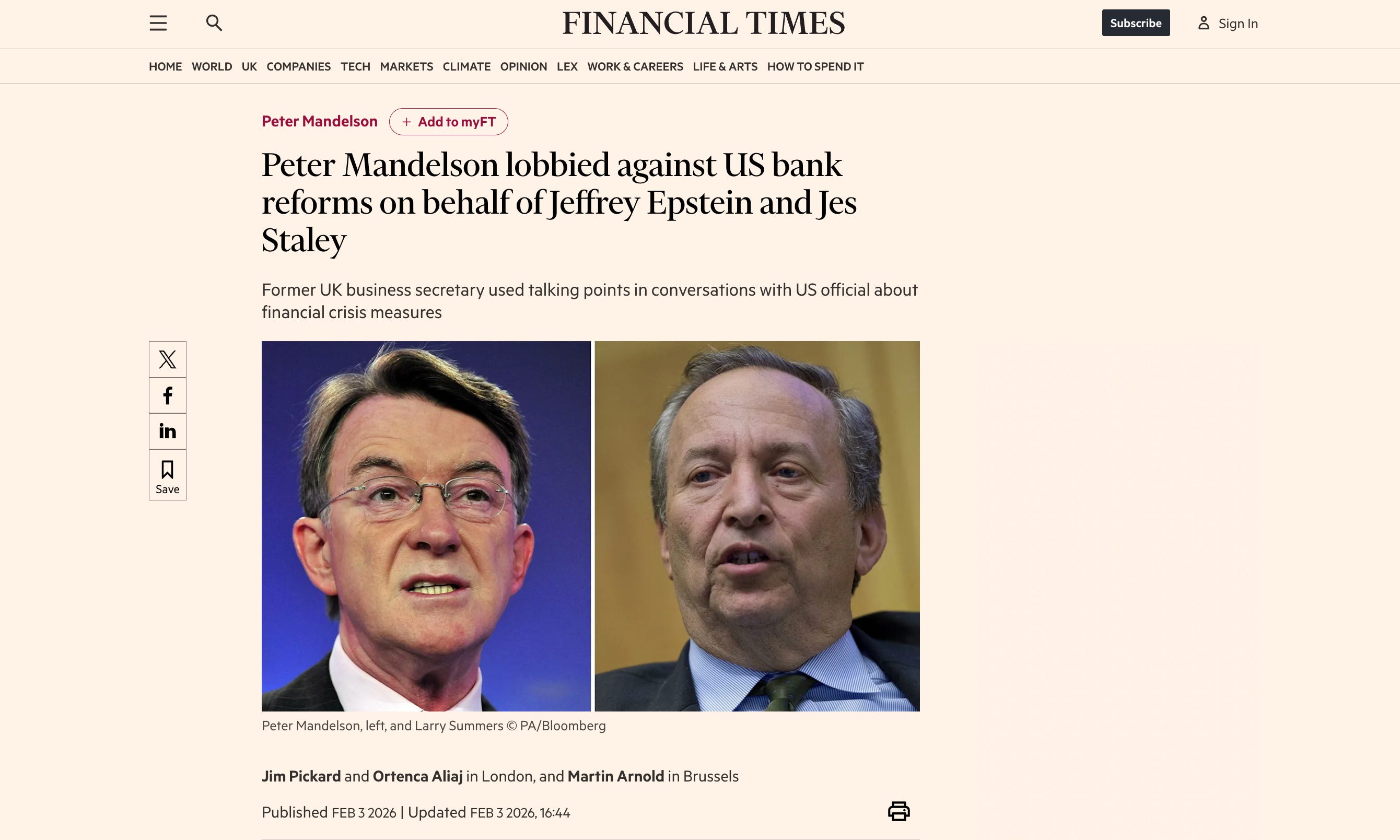 The January 30, 2026 release made it worse: bank statements confirmed Epstein’s $75,000 in payments, and Mandelson is now accused of lobbying the US government in 2010 to water down restrictions on bank trading on behalf of Epstein and Jes Staley137. The Metropolitan Police have launched a criminal investigation into misconduct in public office138. He has resigned from the House of Lords.