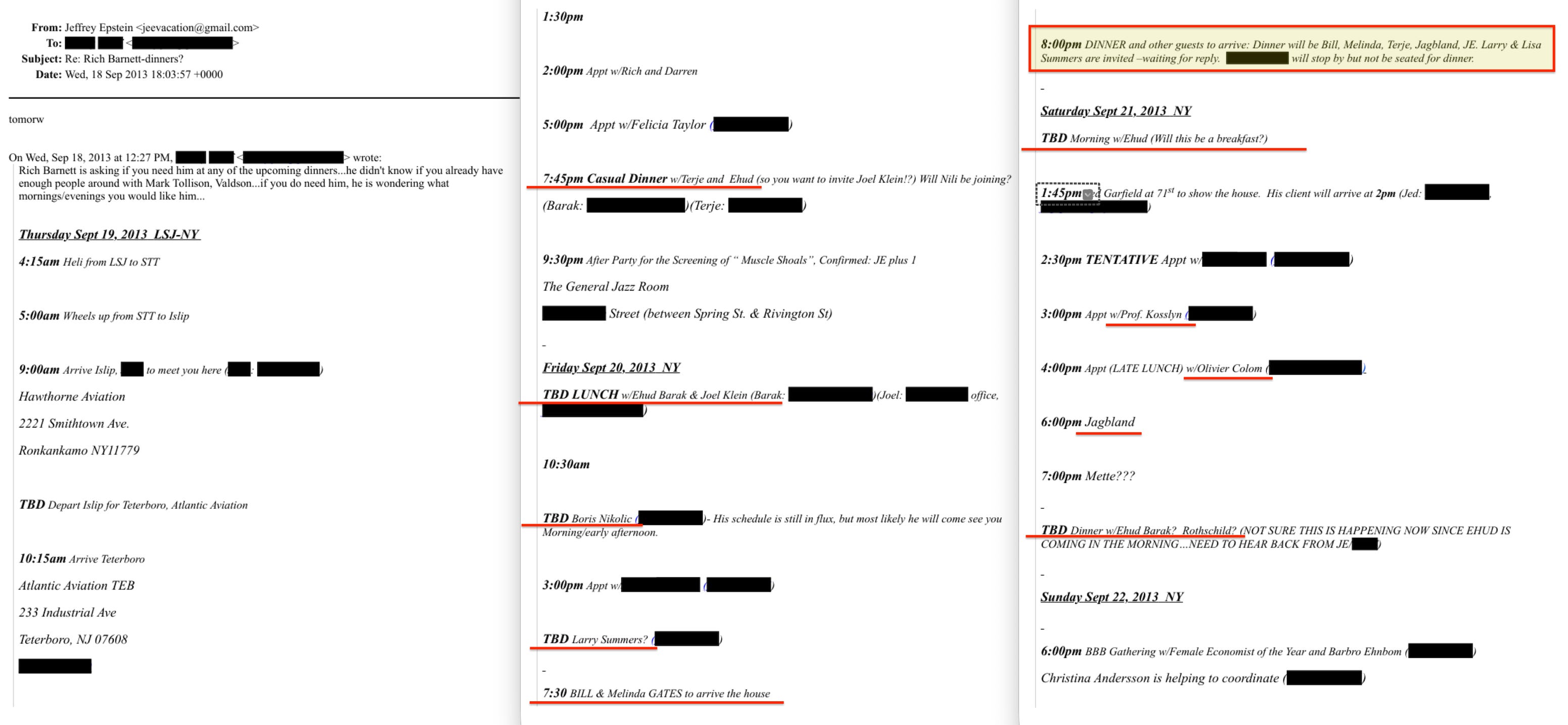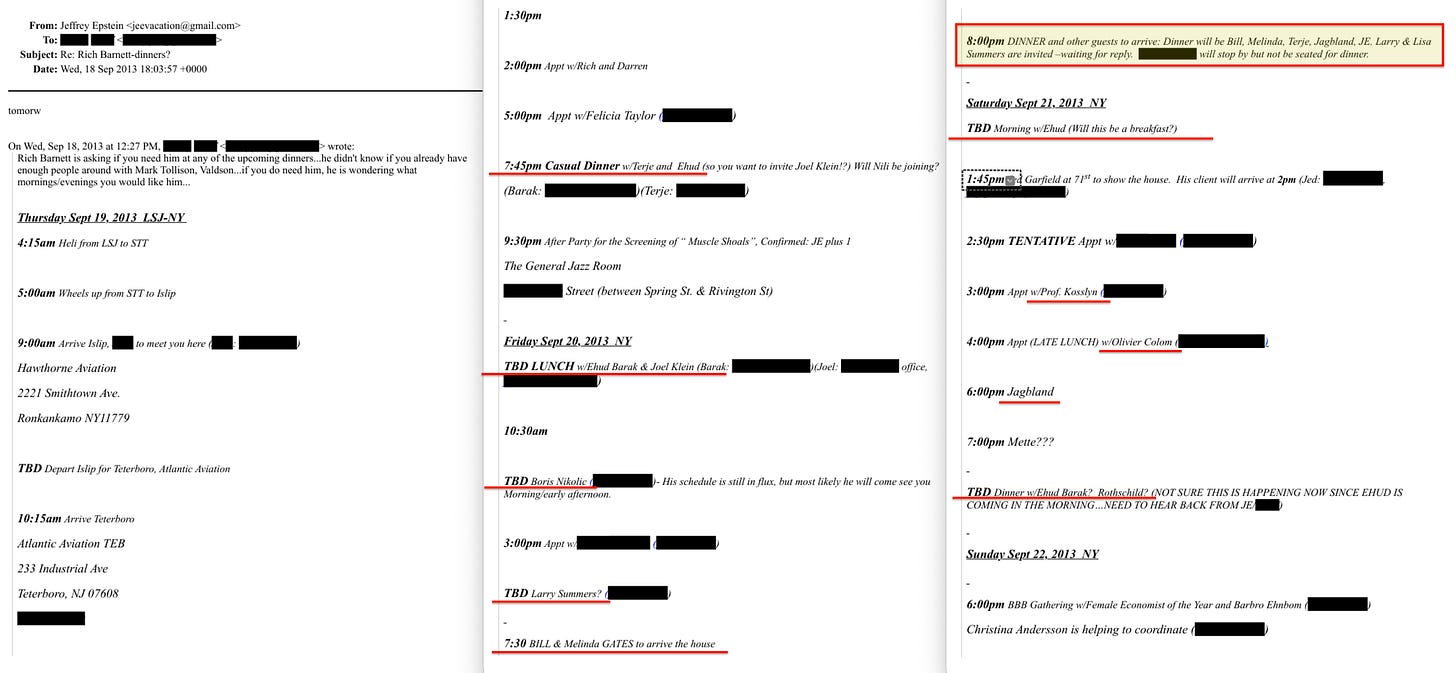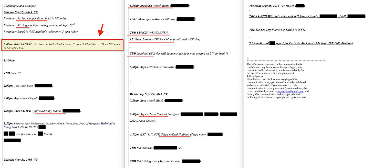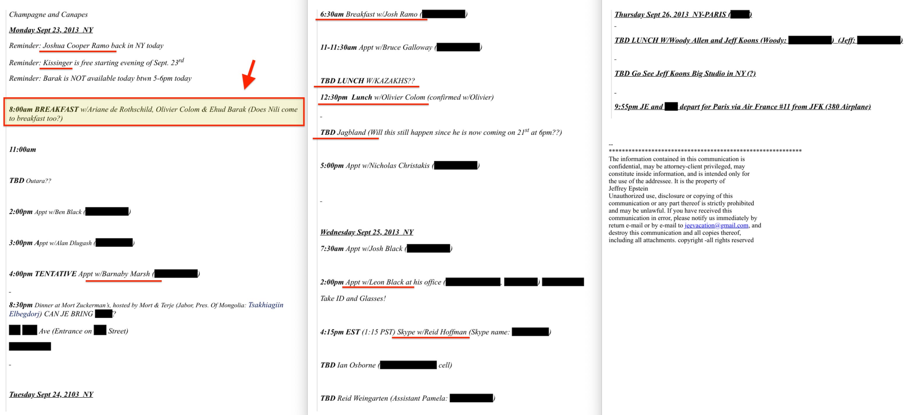 On Saturday, the schedule records a tentative ‘Morning w/Ehud (Will this be a breakfast?)’48, an appointment with Professor Stephen Kosslyn, a late lunch with Olivier Colom (an executive at Edmond de Rothschild), and an evening meeting with Jagland. Then, in all caps: ‘TBD Dinner w/Ehud Barak? Rothschild? (NOT SURE THIS IS HAPPENING NOW SINCE EHUD IS COMING IN THE MORNING...NEED TO HEAR BACK FROM JE)’49.