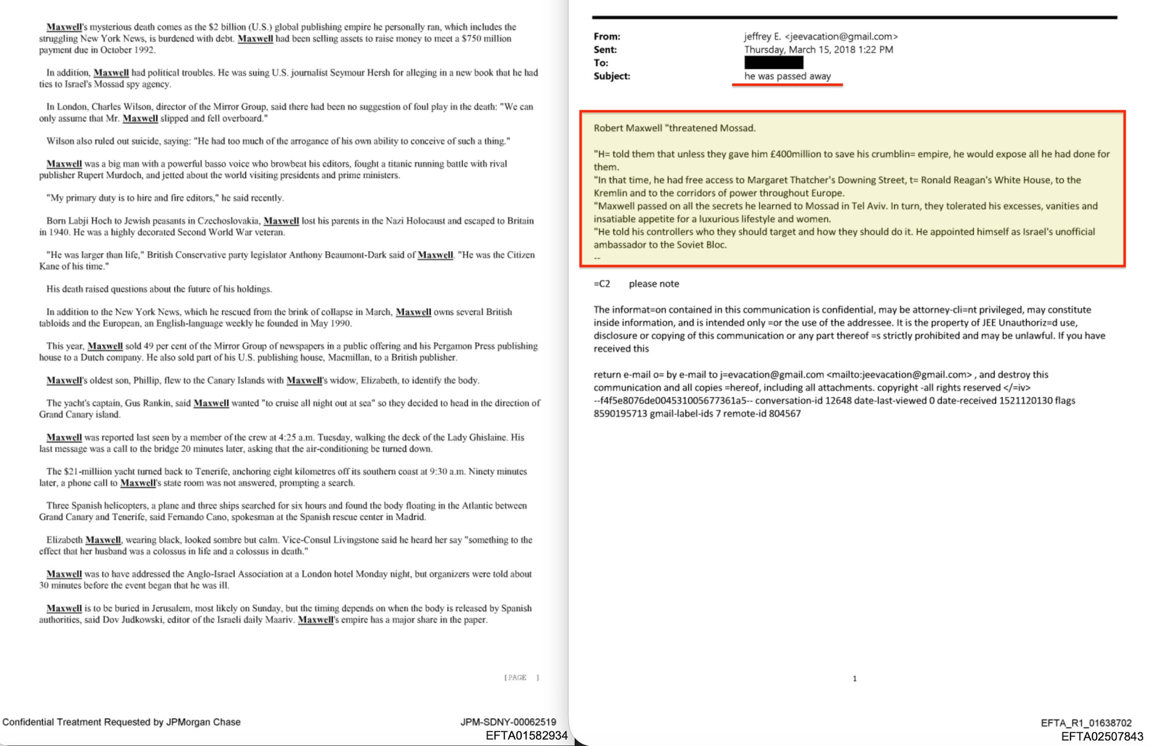 On March 15, 2018 — fifteen months before his arrest — Epstein emailed a redacted recipient with the subject line ‘he was passed away’126, forwarding a passage about Robert Maxwell, Ghislaine’s father127: ‘Maxwell passed on all the secrets he learned to Mossad in Tel Aviv. In turn, they tolerated his excesses, vanities and insatiable appetite for a luxurious lifestyle and women’.