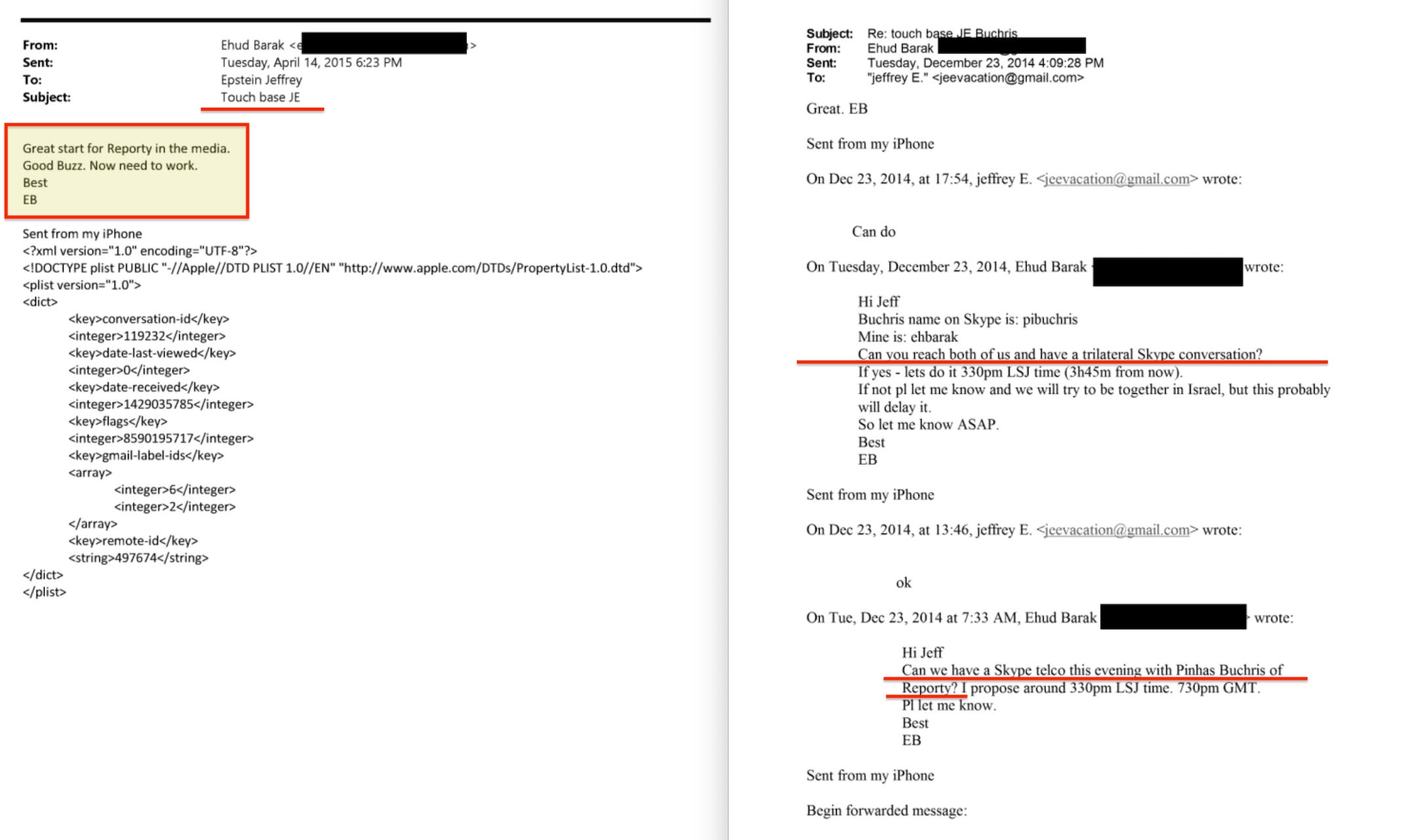 On December 23, 2014, Barak asked Epstein to arrange a trilateral Skype call with Pinhas Buchris — former commander of Unit 820099, Israel’s signals intelligence directorate, the equivalent of the NSA — identified in the email as working with Reporty. ‘Can you reach both of us and have a trilateral Skype conversation?’ The subject line, ‘touch base JE Buchris’, implies an existing Epstein-Buchris relationship100.