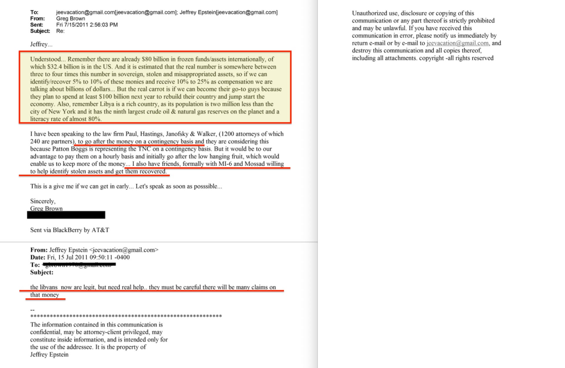 Brown then disclosed the operational resources: ‘I also have friends, formally [sic] with MI-6 and Mossad willing to help identify stolen assets and get them recovered’. He had already engaged Paul, Hastings, Janofsky & Walker — a firm with 1,200 attorneys — ‘to go after the money on a contingency basis’. Former officers of British and Israeli intelligence, coordinated through Epstein’s email, deployed to seize sovereign assets during an active NATO military intervention. Epstein replied: ‘the libyans now are legit, but need real help.. they must be careful there will be many claims on that money’.