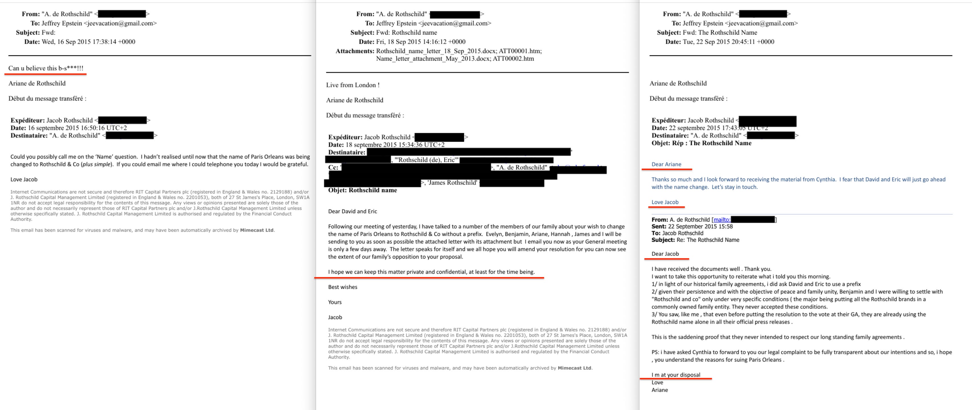 An email exchange from July 1, 2013 shows the depth of the briefing. Ariane wrote to Epstein describing the problem of the rival branch93: ‘The problem with a merger is what each side considers it s worth and also David s deep conviction that they are ‘the only true Rothschilds’ allowed to do banking. And therefore, i should merge with them and become a passive shareholder’. In the same email, she asked Epstein to arrange meetings with Barak, Gates, and Summers.