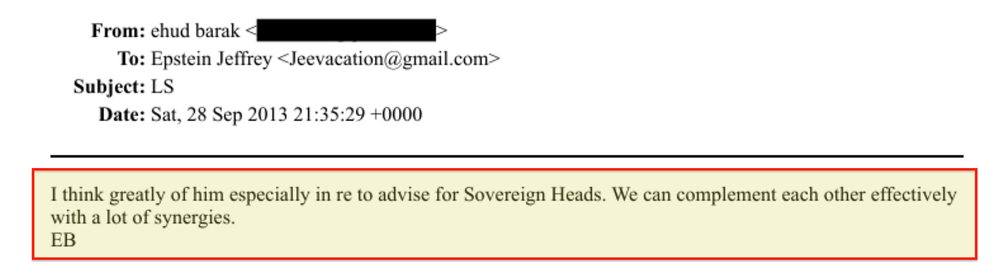Two days after the summit ended, Barak emailed Epstein with the subject line ‘LS’58: ‘I think greatly of him especially in re to advise for Sovereign Heads. We can complement each other effectively with a lot of synergies’.