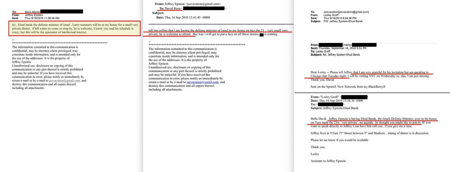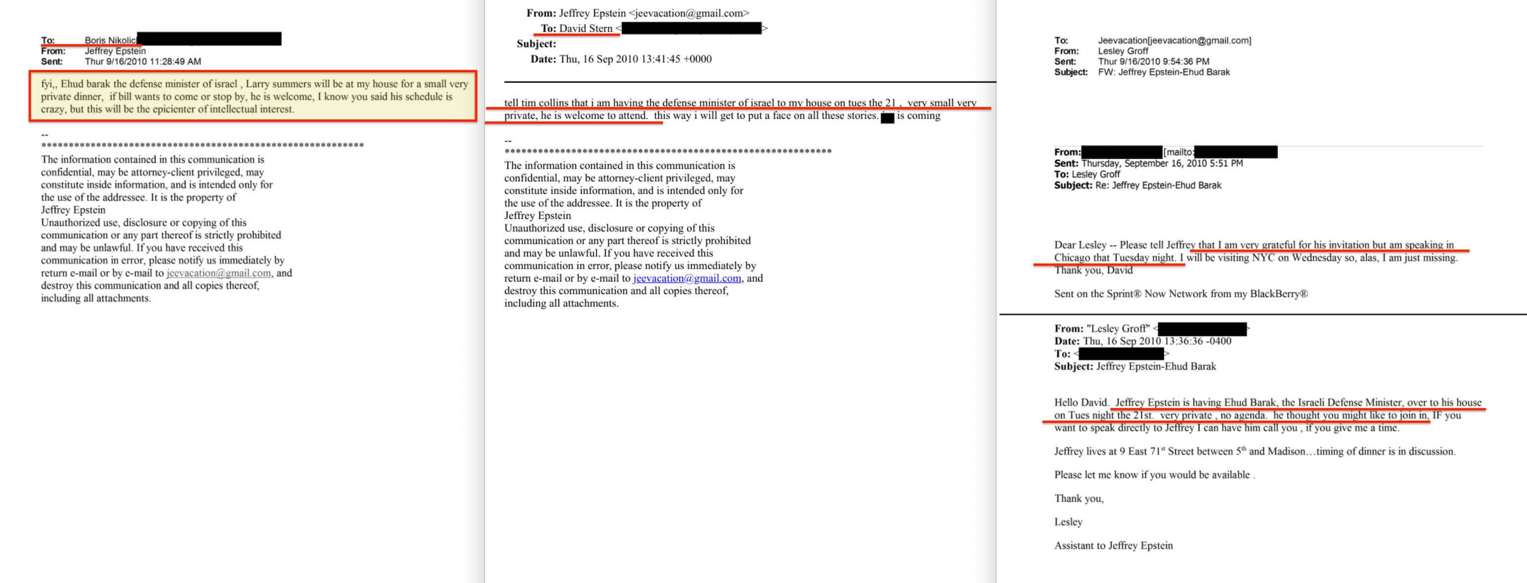 On the morning of September 16, 2010, Epstein sent at least four separate communications assembling a guest list for a dinner at his Manhattan residence, scheduled for Tuesday, September 21. Barak was then the sitting Israeli Defence Minister.