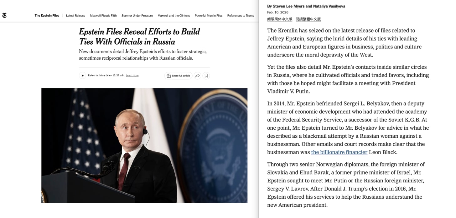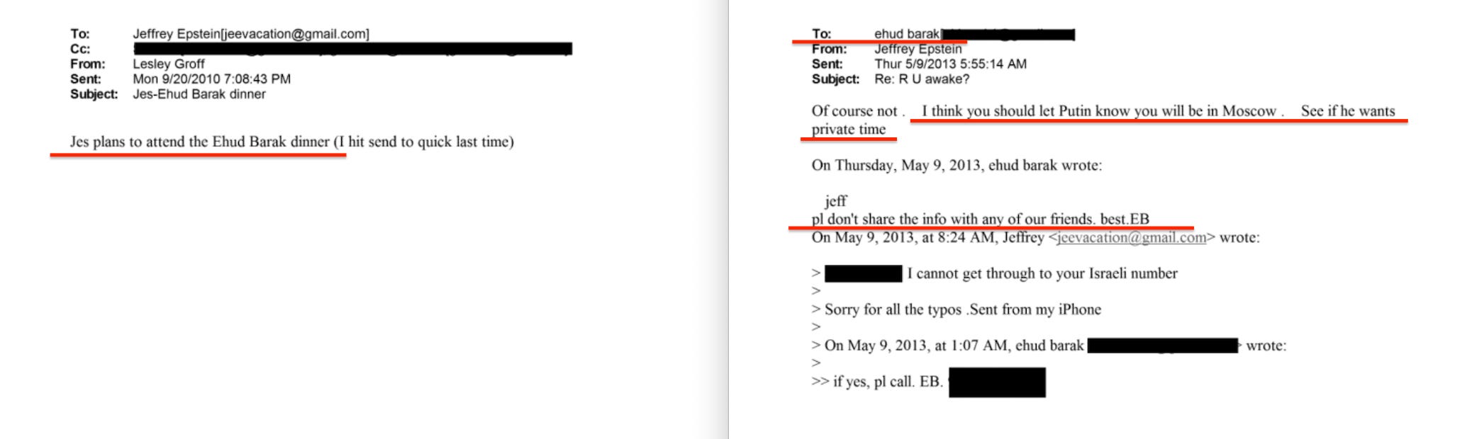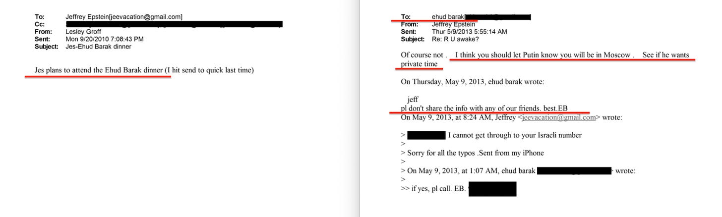 Epstein’s reply confirms receipt and pivots immediately to geopolitics: ‘Of course not. I think you should let Putin know you will be in Moscow. See if he wants private time’. Drop Site News later reported, drawing on the Handala leak of Barak’s emails, that Epstein had helped broker a covert backchannel between Israel and Russia during the Syrian civil war14 — an attempt to persuade the Kremlin to abandon Assad, a major Israeli national security priority.
