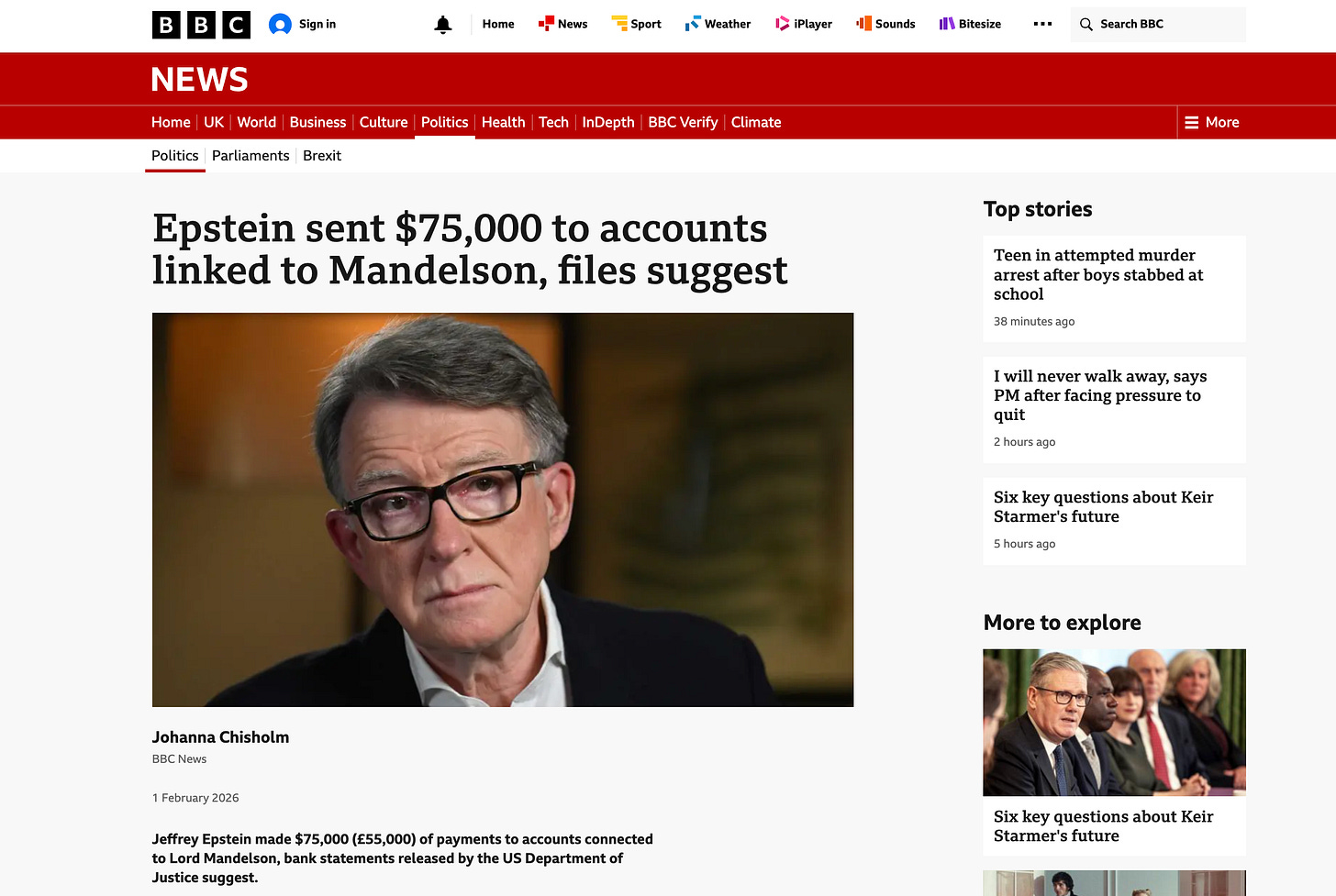 Mandelson’s exposure went furthest. In December 2024, Keir Starmer appointed him UK Ambassador to the United States135 — Britain’s most important diplomatic post, given to a man the DOJ archive documents as a paid asset in the Epstein network. He was fired in September 2025 after emails showed the depth of his relationship with Epstein was ‘materially different’ from what had been disclosed136.