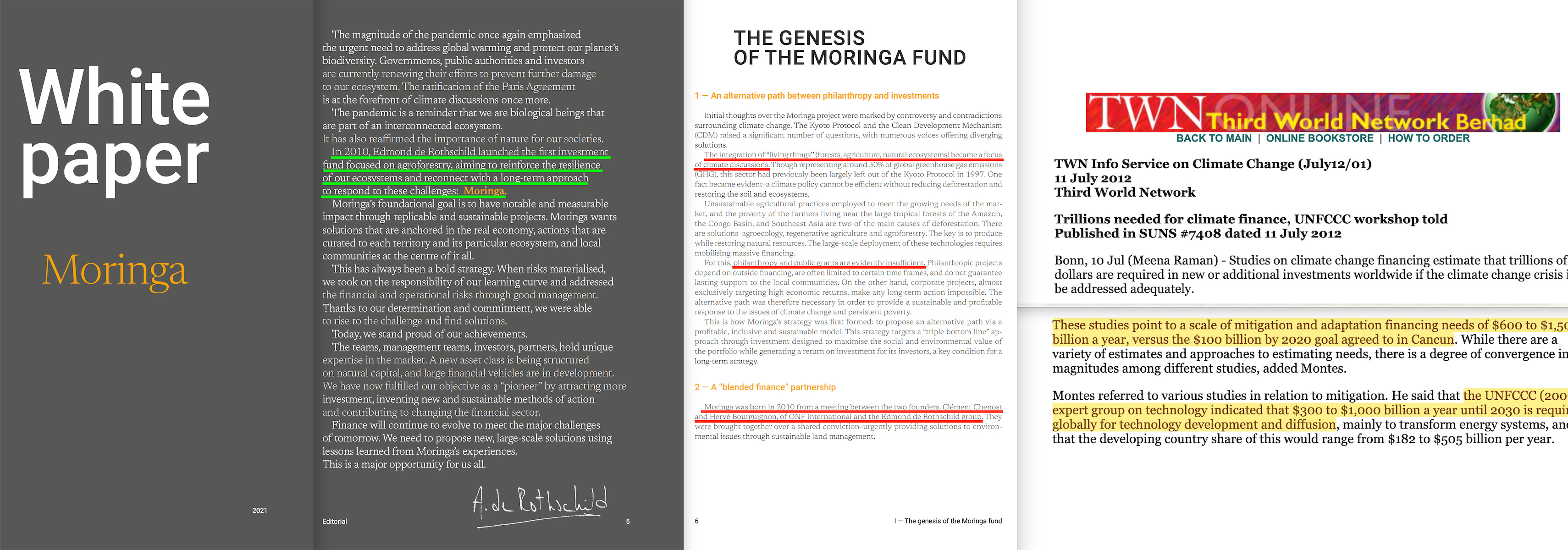 The pilot agroforestry ‘blended finance’ fund arrived already in 2010. Moringa, owned by the Ariane-led Edmond de Rothschild outfit in Geneva69.