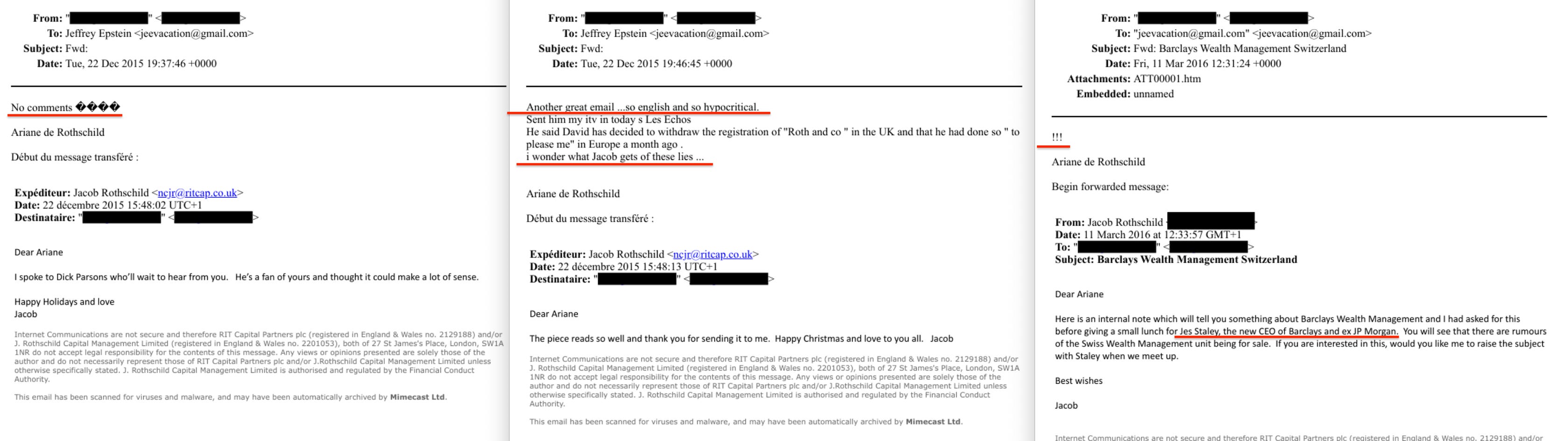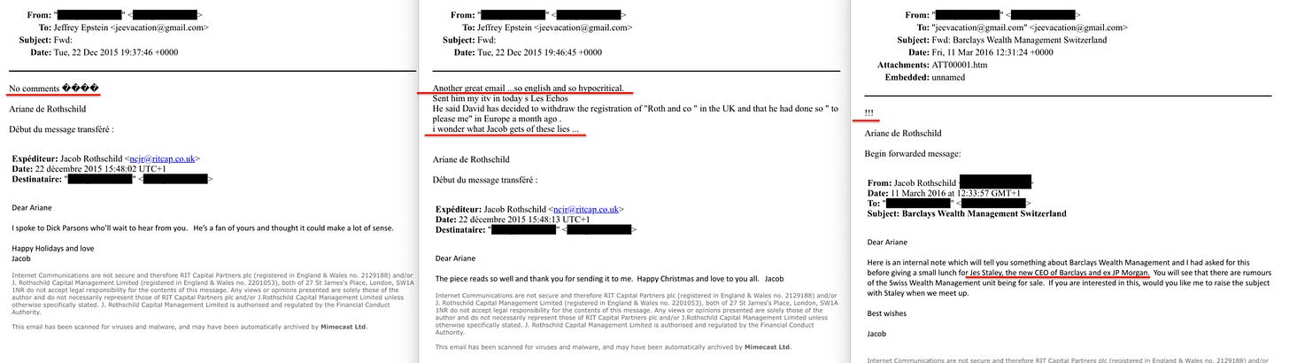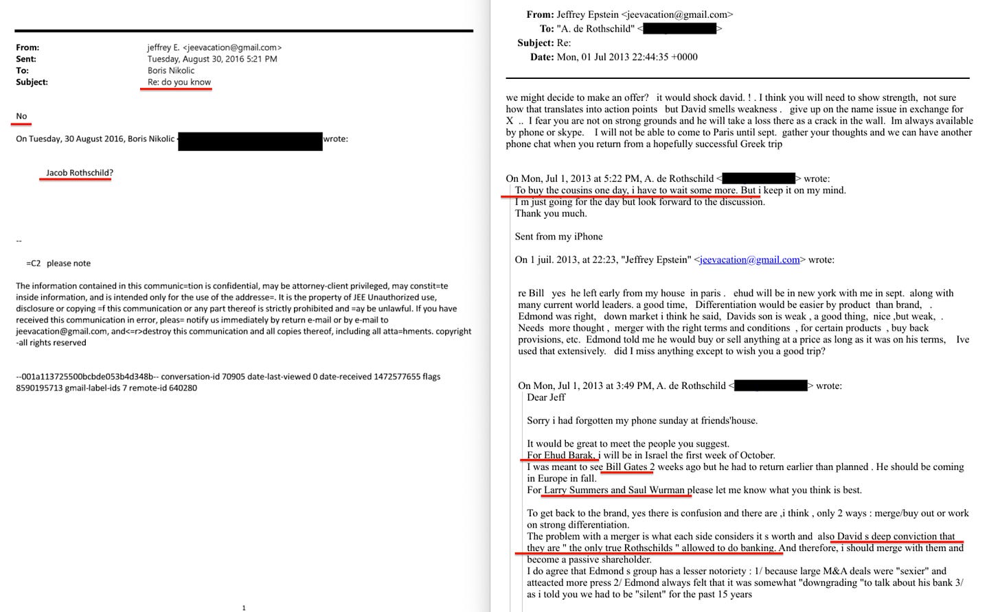 On August 30, 2016, Boris Nikolic — Gates’s chief science adviser — emailed Epstein with a two-word question: ‘Jacob Rothschild?’ Epstein replied92: ‘No’. He denied knowing Jacob Rothschild while sitting on a year’s worth of Jacob’s forwarded correspondence in his inbox.