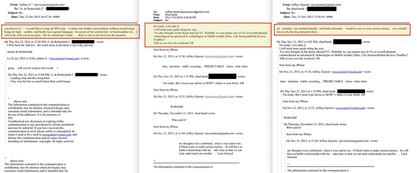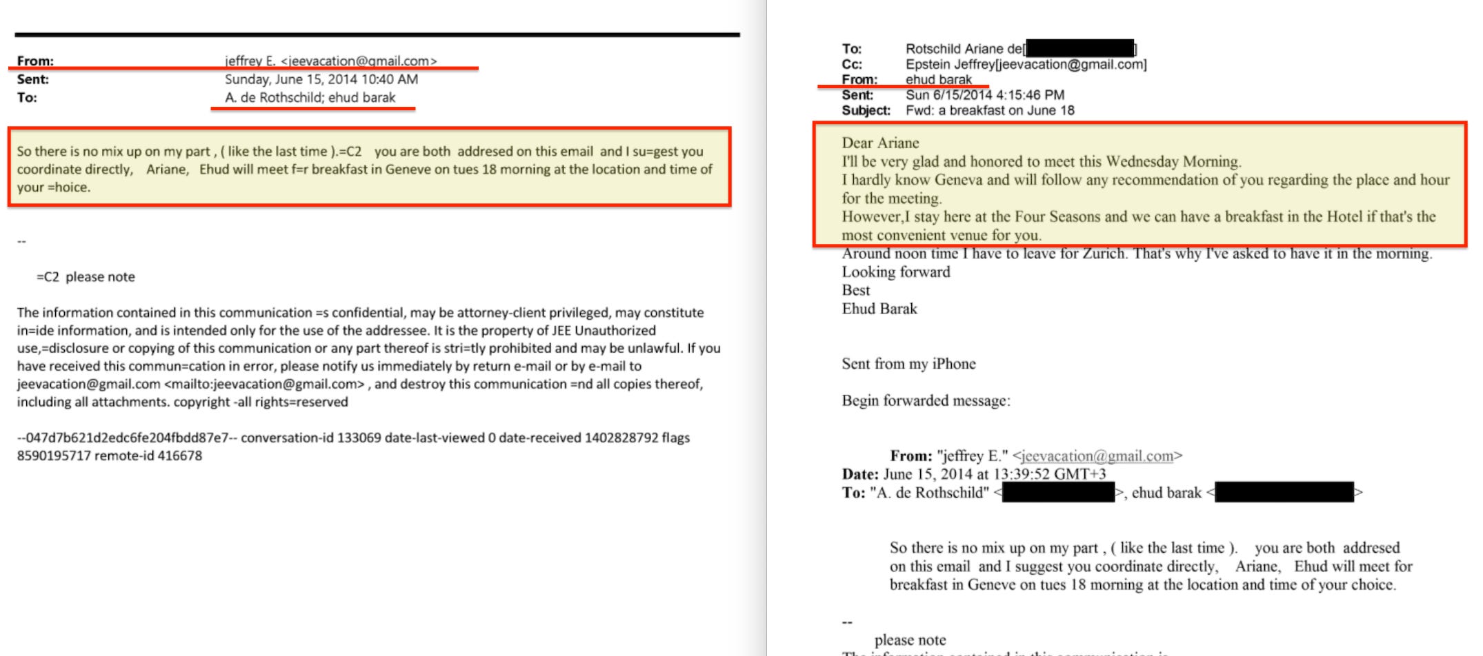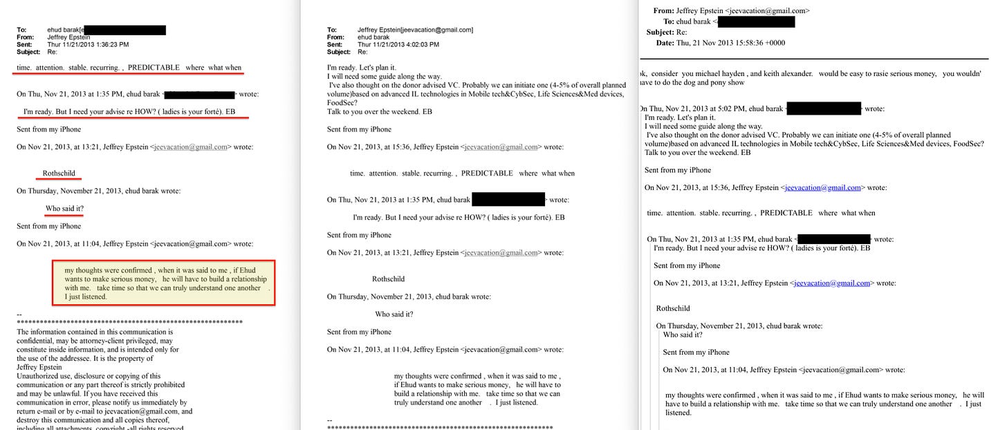 An email thread from November 21, 2013 — two months after the September summit breakfast — captures what followed. Epstein wrote to Barak72: ‘my thoughts were confirmed, when it was said to me, if Ehud wants to make serious money, he will have to build a relationship with me. take time so that we can truly understand one another. I just listened’. Barak: ‘Who said it?’ Epstein: ‘Rothschild’. The inclusion of the phrase ‘my thoughts were confirmed’ implies a prior expectation, confirmed by whatever Ariane communicated during or after the Monday morning breakfast at which the week’s operational results were presented.