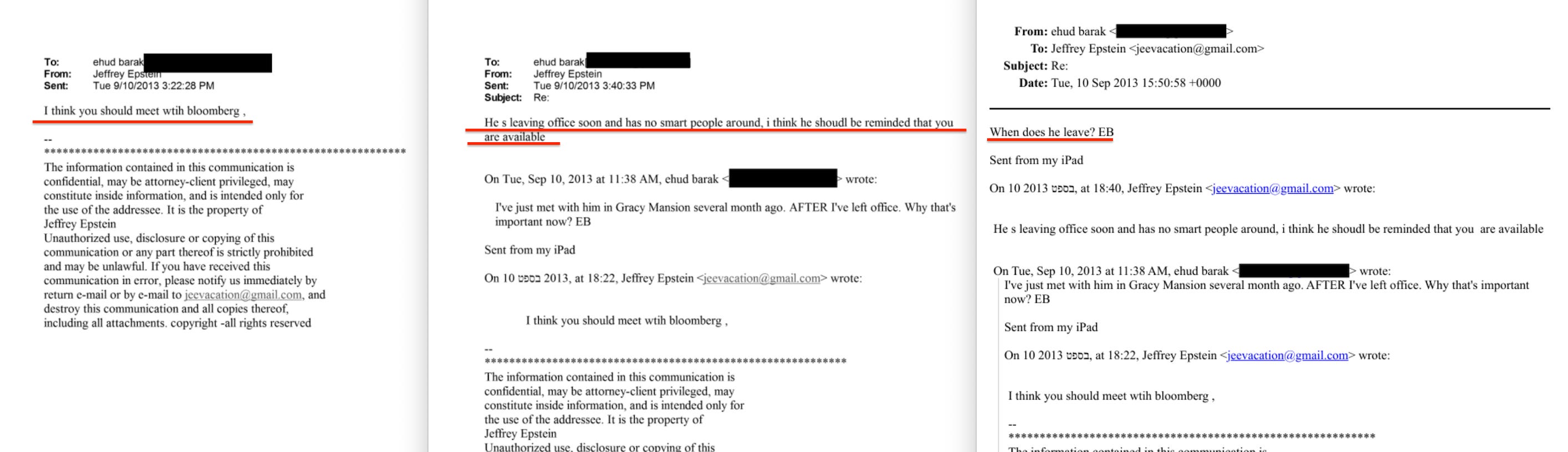 Ten days before the summit, on September 10, Epstein wrote to Barak54: ‘I think you should meet wtih bloomberg’. Barak pushed back55: ‘I’ve just met with him in Gracy Mansion several month ago. AFTER I’ve left office. Why that’s important now?’ Epstein replied56: ‘He s leaving office soon and has no smart people around, i think he shoudl be reminded that you are available’. Barak57: ‘When does he leave?’
