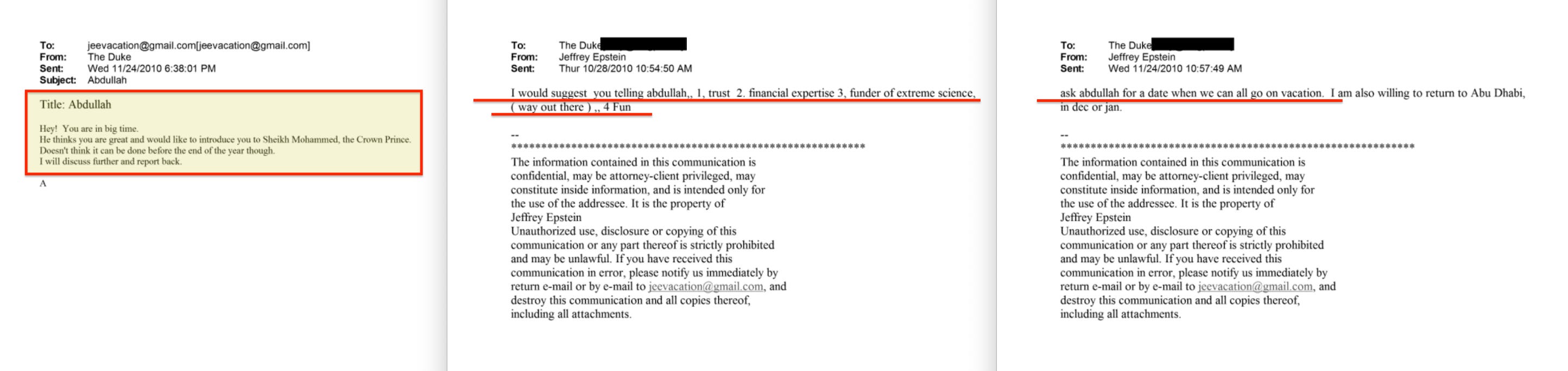 Andrew’s principal value to the operation was his access to sovereign heads of state. On November 24, 2010, during a state visit to the United Arab Emirates, Andrew emailed Epstein with the subject line ‘Abdullah’ — a reference to the UAE’s then foreign affairs minister, Abdullah bin Zayed. ‘You are in big time’, Andrew wrote30. ‘He thinks you are great and would like to introduce you to Sheikh Mohammed, the Crown Prince’.