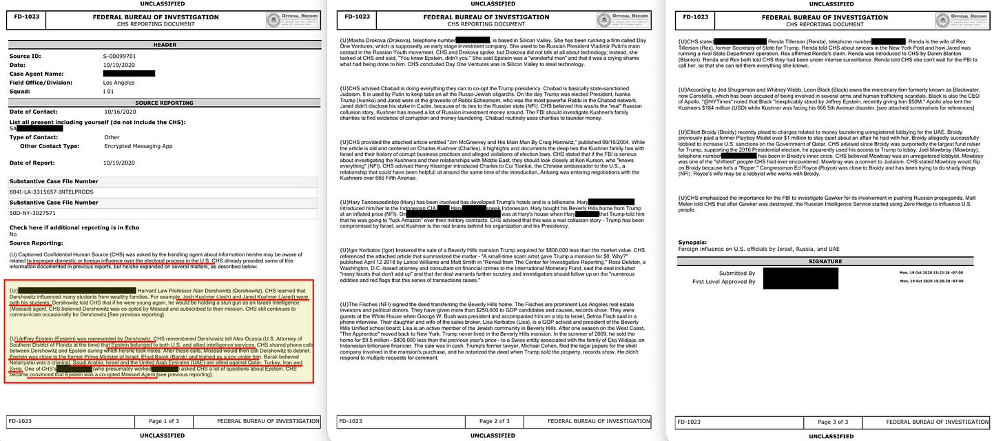 The FBI arrived at the same conclusion the documents suggest. An FD-1023 source reporting document dated October 19, 2020 records a confidential human source with personal contact with figures in Epstein’s circle. The case designation matters: INTELPRODS denotes intelligence products, meaning the FBI classified this as counterintelligence rather than a criminal matter. The document’s synopsis line reads121: ‘Foreign influence on U.S. officials by Israel, Russia, and UAE’.