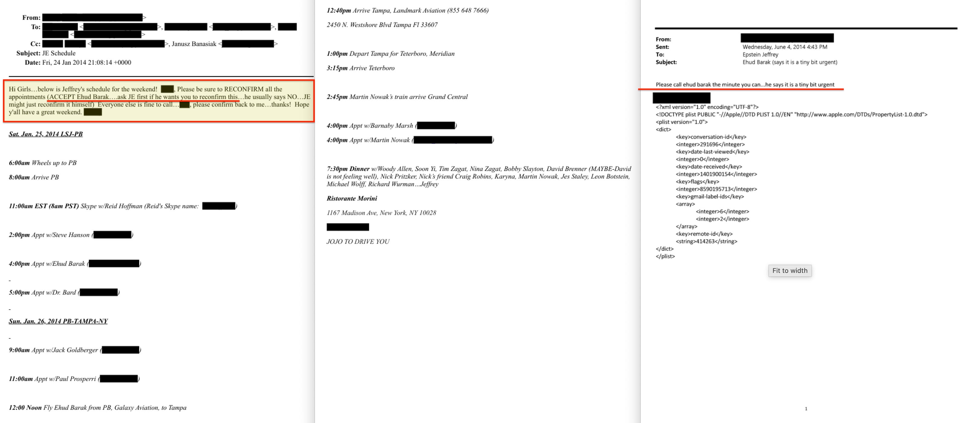 The January 2014 schedule also records6: ‘12:00 Noon Fly Ehud Barak from PB, Galaxy Aviation, to Tampa’. Epstein was providing private aviation for Barak’s movements between Palm Beach and Tampa.