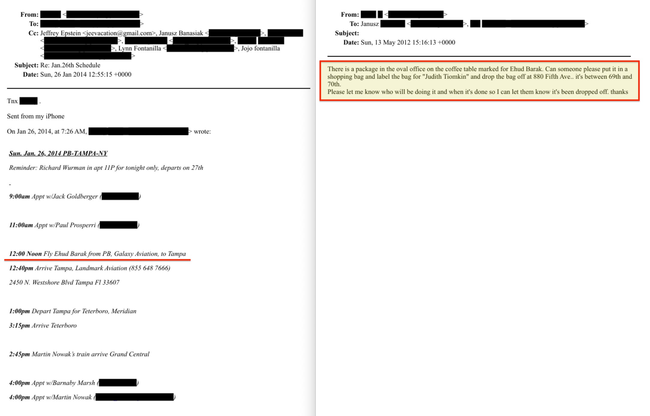 On May 13, 2012 — while Barak was the sitting Defence Minister — a staff email instructed7: ‘There is a package in the oval office on the coffee table marked for Ehud Barak. Can someone please put it in a shopping bag and label the bag for ‘Judith Tiomkin’ and drop the bag off at 880 Fifth Ave’. A package for the Israeli Defence Minister, relabelled under a cover name before hand-delivery to a building two blocks south of Epstein’s townhouse.