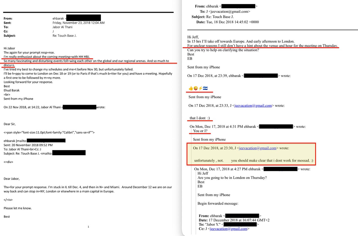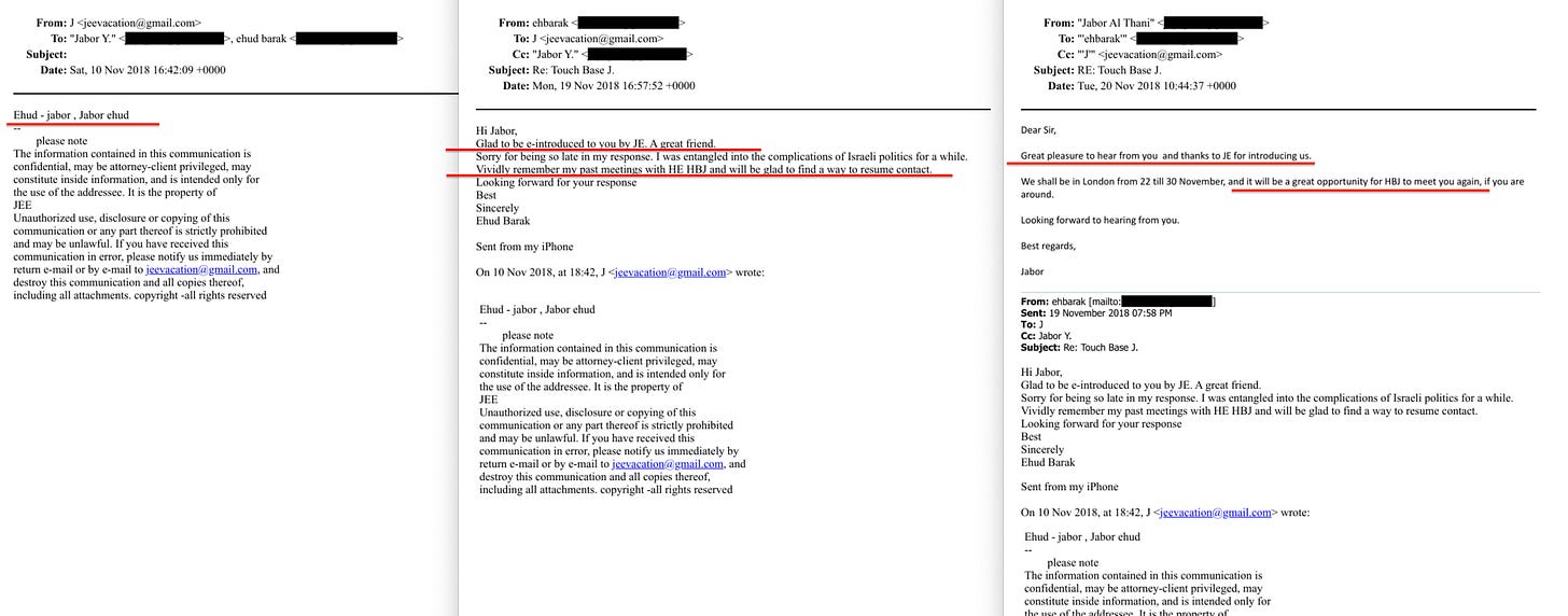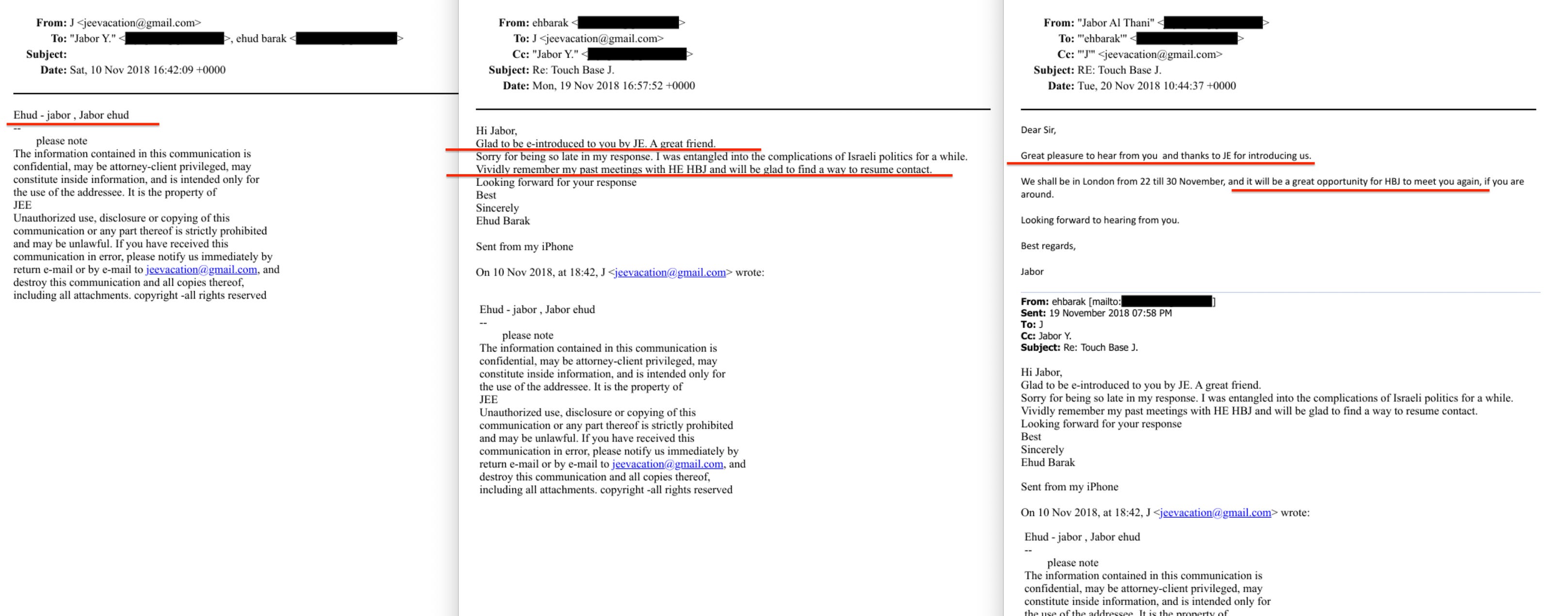 Barak referenced ‘past meetings with HE HBJ’ — His Excellency Hamad bin Jassim Al Thani, the former Prime Minister of Qatar, one of the wealthiest individuals on earth. Jabor replied117: ‘Great pleasure to hear from you and thanks to JE for introducing us’.