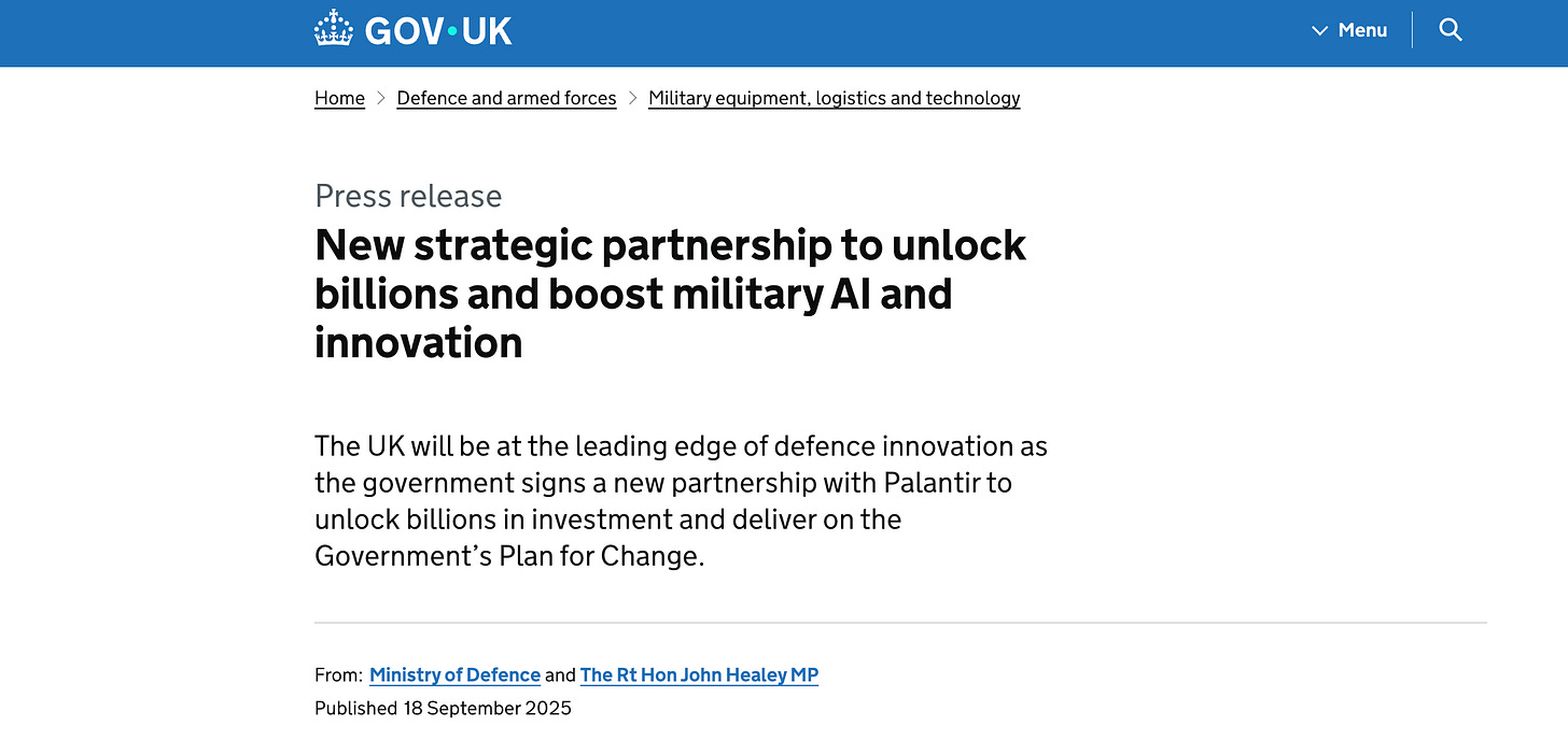 In September 2025, the UK government signed a partnership agreement making London the base for Palantir’s European defence business, with a pledged investment of £1.5 billion146.