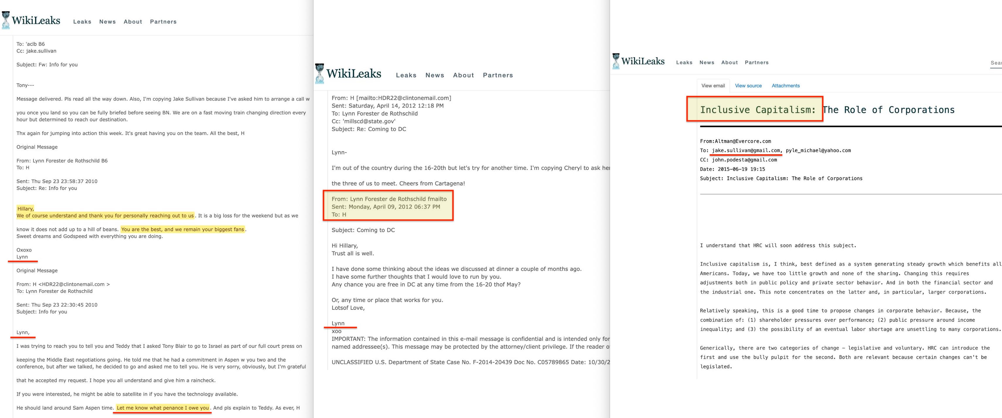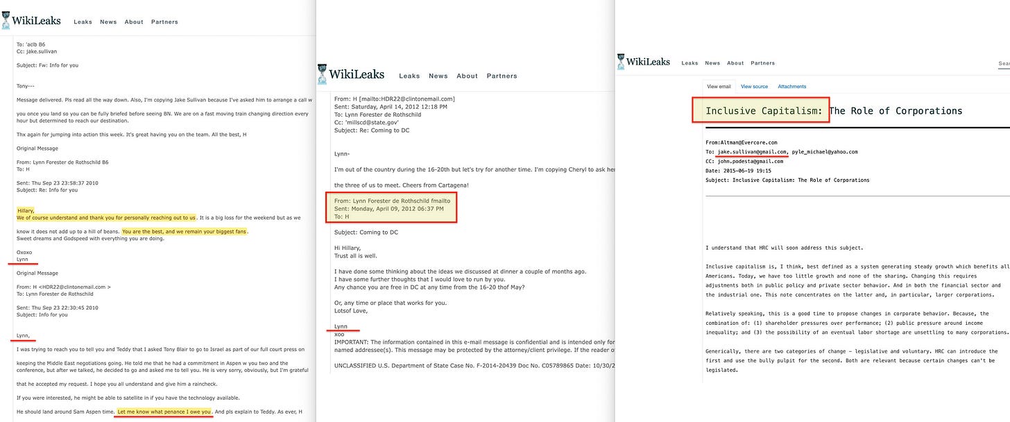The function was not unique to the Epstein network. The Podesta emails, released in 2016, appears to document Lynn Forester de Rothschild performing a structurally identical role in the adjacent political network. She is a constant presence in correspondence with Hillary Clinton and John Podesta, organising meetings, shaping economic policy through the ‘Inclusive Capitalism’ initiative128, and bridging political operatives to sovereign capital. She emailed Clinton: ‘I remain your loyal adoring pal’.