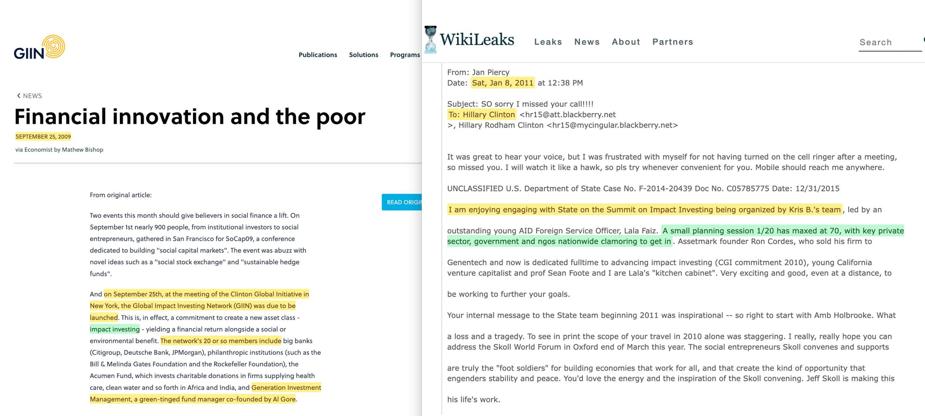 The ‘impact investing’ summit Clinton hosted in April 201263 was the output of an architecture that began with the Rockefeller Foundation's coining of the term in October 200764, carried through by Al Gore, Hillary Clinton, and the Clinton Global Initiative, and was planned through the same private email channel documented throughout this essay.