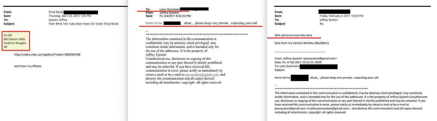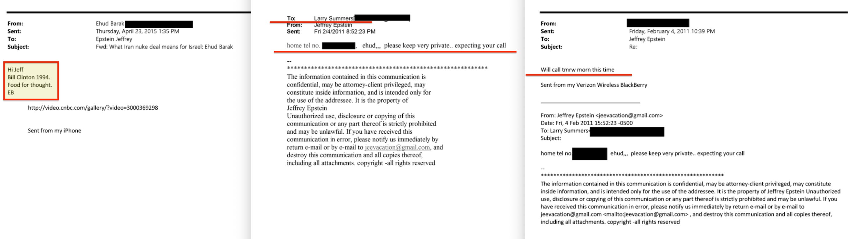 On February 4, 2011, Epstein emailed Larry Summers21: “home tel no. [redacted]. ehud,,, please keep very private.. expecting your call’. Summers replied from his BlackBerry at 10:39 PM22: ‘Will call tmrw morn this time’. A former US Treasury Secretary calling the Israeli Defence Minister at home on a private line, arranged by Epstein, with confirmation routed back to verify the connection had been made.