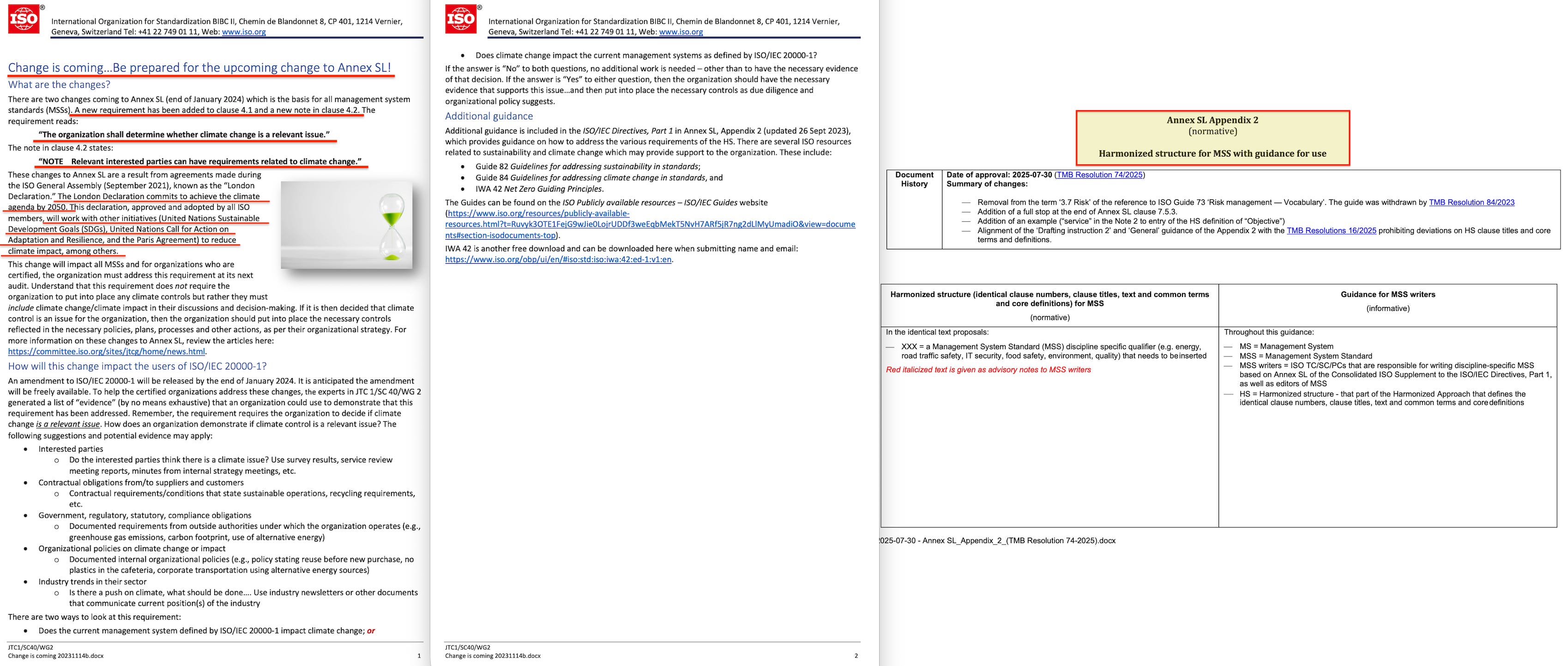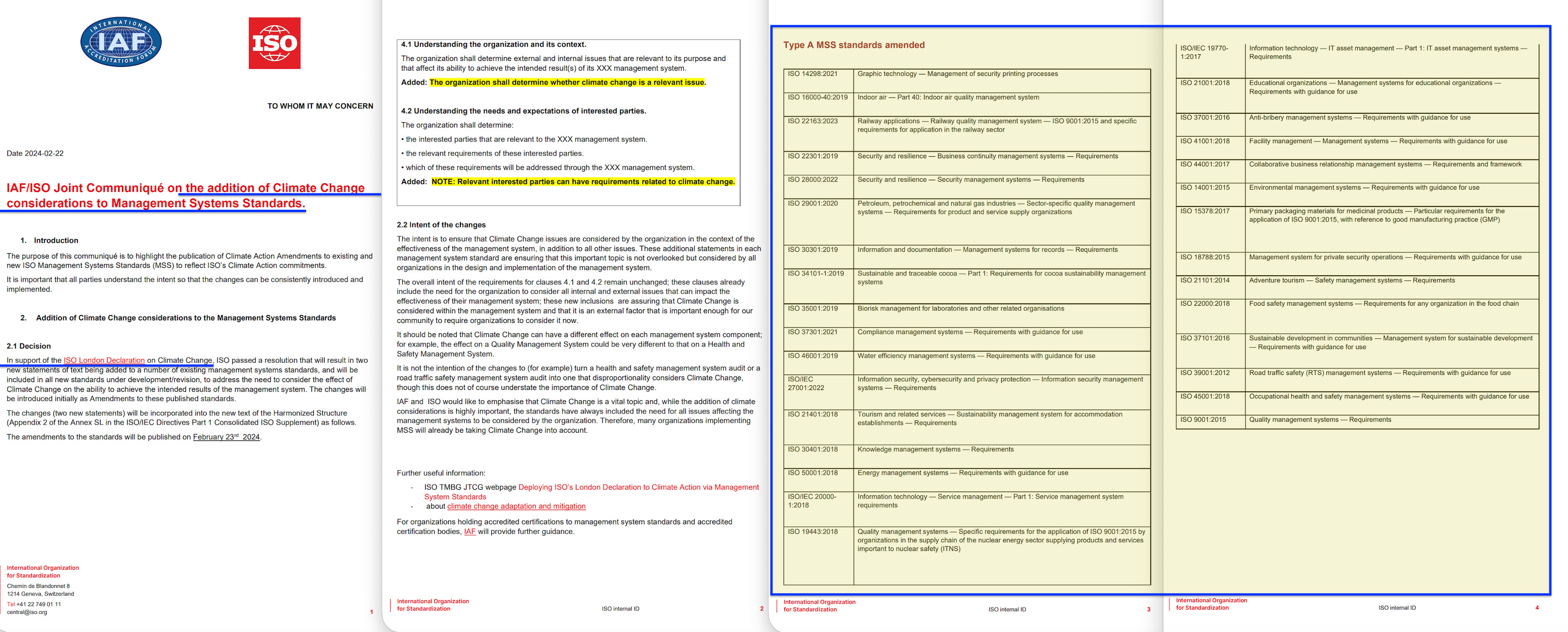 The convergence is not theoretical. On 23 February 2024, ISO published an identical climate action amendment to thirty-one management system standards simultaneously66. The same two sentences were inserted into ISO 9001 (quality management), ISO 14001 (environmental management), ISO 22000 (food safety), ISO 22301 (business continuity), ISO 27001 (information security), ISO 45001 (occupational health and safety), ISO 50001 (energy management), ISO 37001 (anti-bribery), ISO 37301 (compliance management), ISO 21001 (education), ISO 37101 (sustainable communities), and twenty more. Every organisation certified under any of those standards must now determine whether climate change is a relevant issue and acknowledge that interested parties may have climate-related requirements.