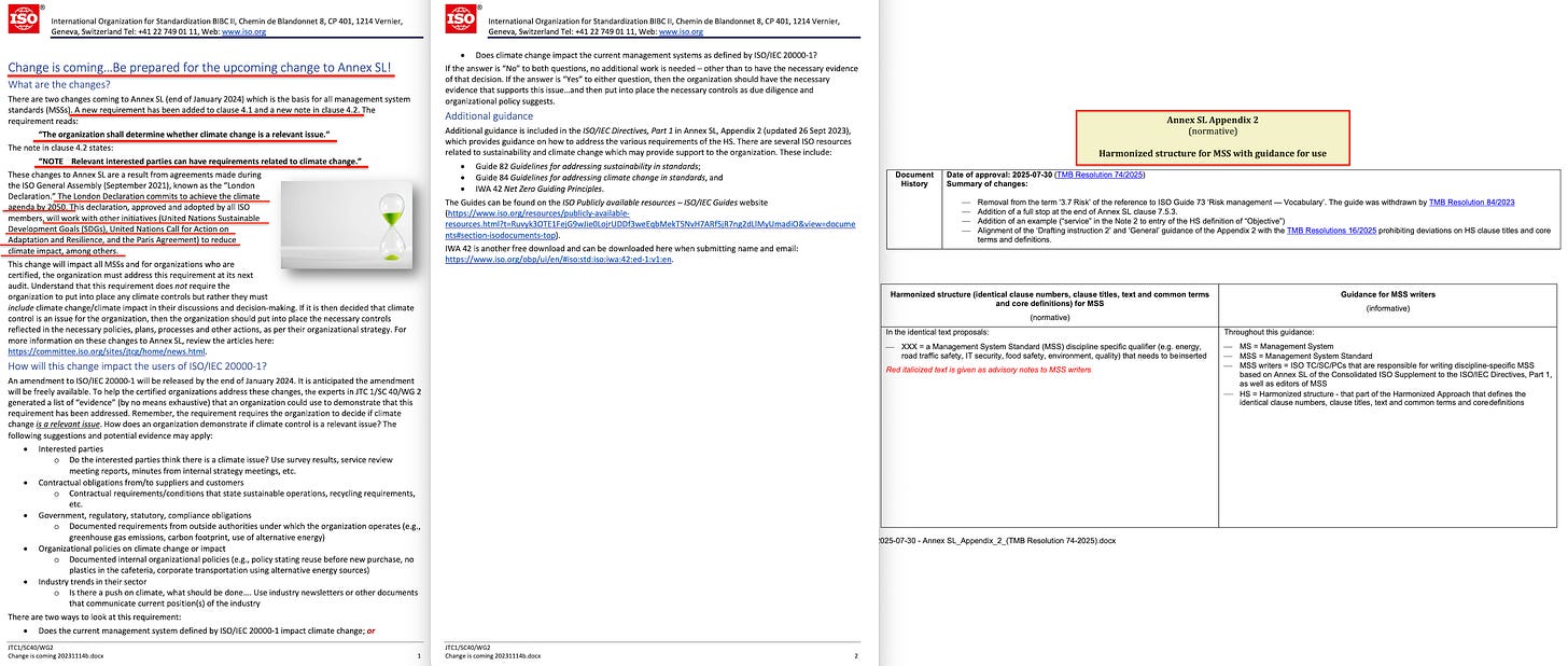 Two sentences — thirty-one standards. Every domain — quality, security, food, energy, health, education, governance, compliance — brought onto a single compliance surface in a single administrative act. The standards were not merged. They didn’t need to be. The same clause was inserted into all of them, and every organisation certified under any one of them now shares a common obligation with every organisation certified under any other. The amendment was justified by the ISO London Declaration of 2021 — ISO’s commitment to combat climate change67.