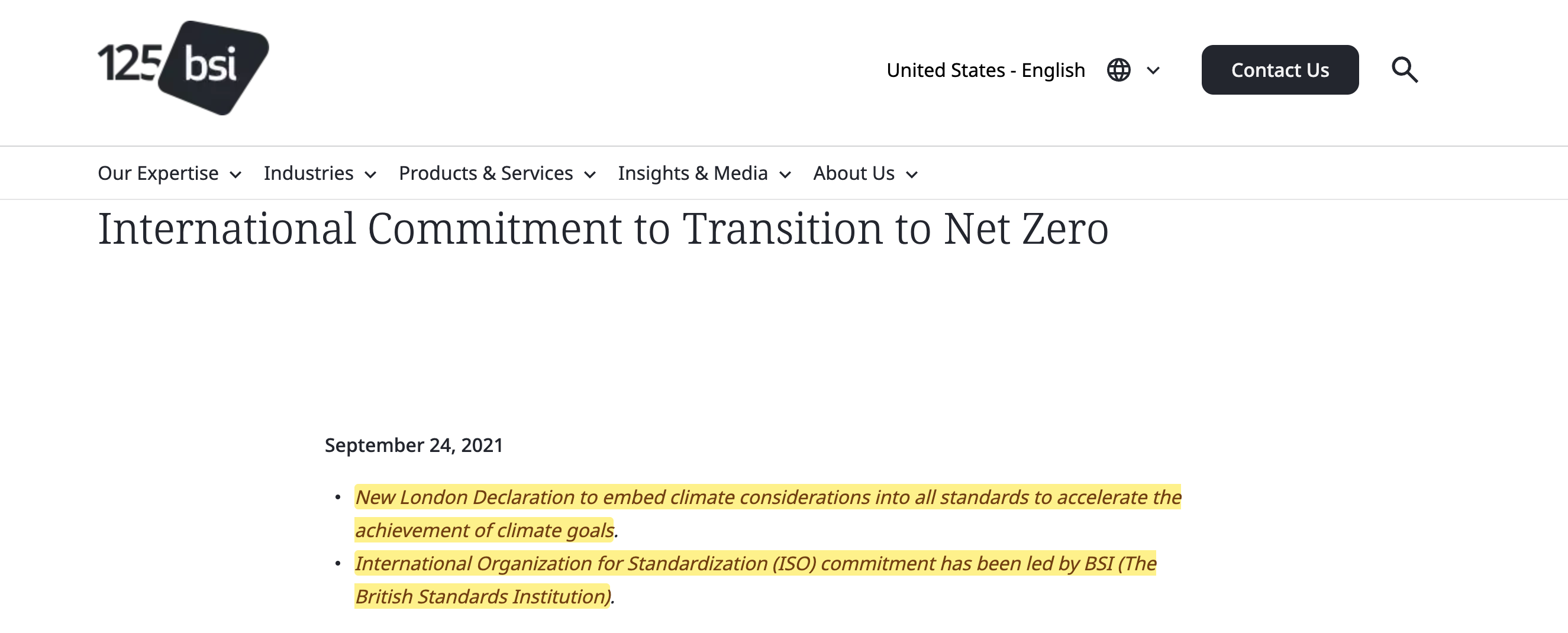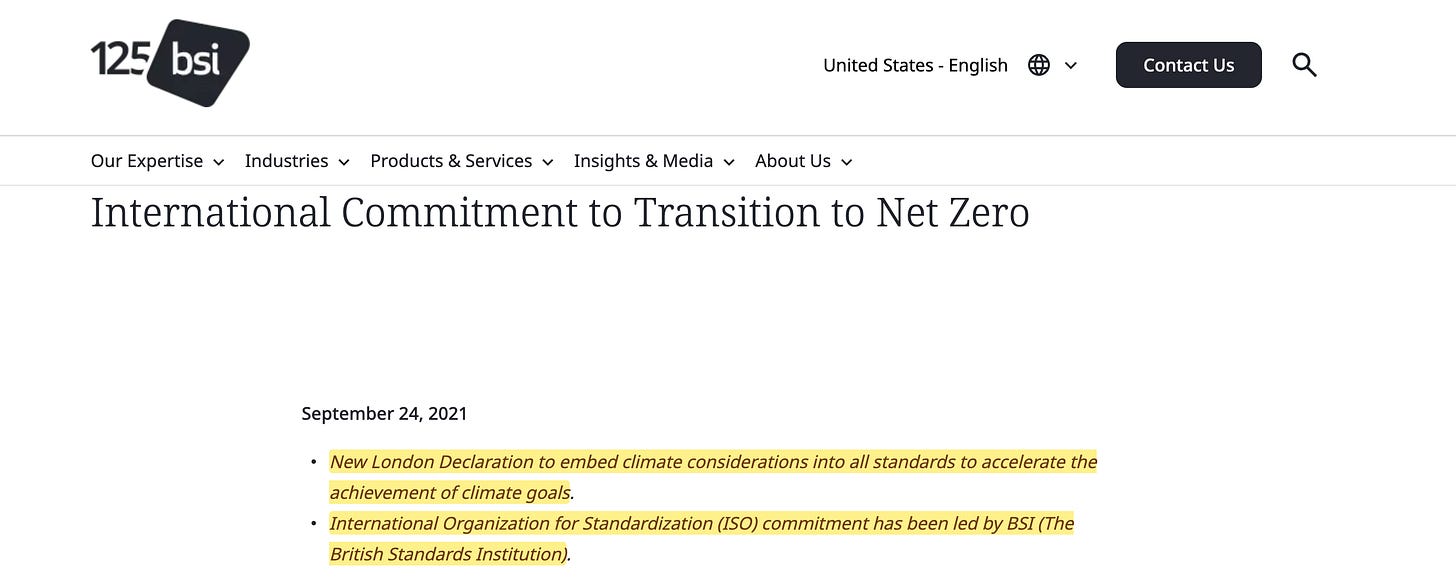 BSI — the British Standards Institution, the world’s first national standards body, founded in 1901 — originated the London Declaration70. BSI’s own communications state this directly. BSI also holds the secretariat for TC32271 (Sustainable Finance) and TC30972 (Governance of Organizations). One institution administers the sustainable finance standard, the governance standard, and the procedural mechanism that inserted climate into every management system standard ISO publishes.