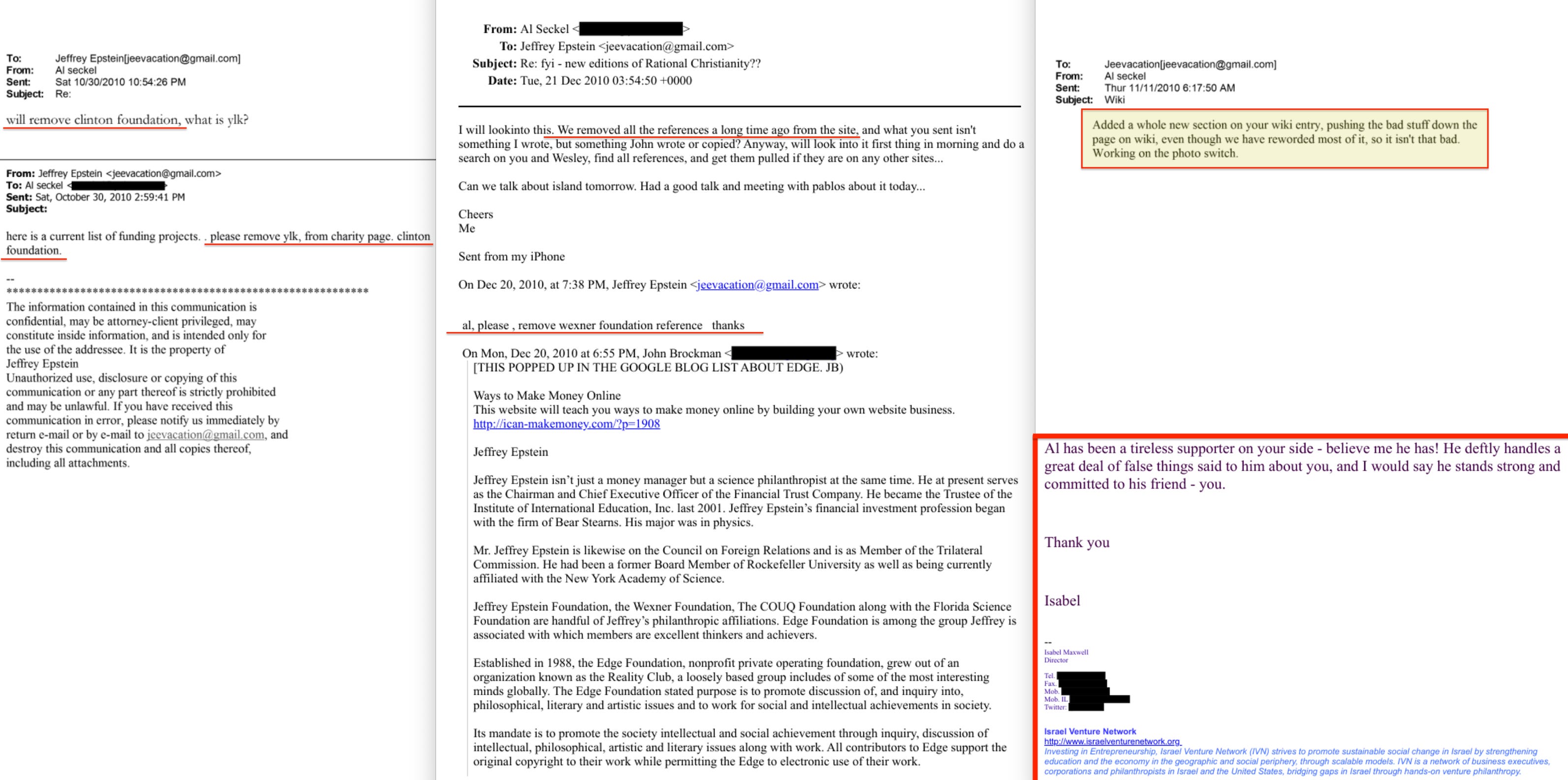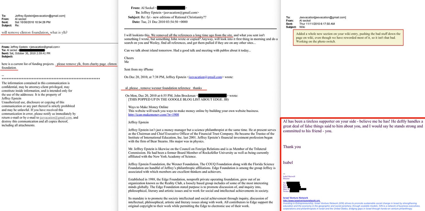 I would add a facet to your description of Al Seckel (Isabel Maxwell's bigamist husband), his role in the sordidness. Your pieces, this and an earlier one you link to describe him as heading up "Mindshift." His general title, with many working subtitles for his pursuits, was as a "Perceptual Scientist." I recently did my own diving into that field and learned that it is one of the pseudosciences that are useful in shaping the 'cognitive infrastructure' of humanity. Along with behavioral scientists, narrative controllers using propaganda and censorship to alter perceptions and coerce changes in a targeted population's behaviors. Aka "The Science"(TM) of the plandemic. Perceptual science is a key plank in a technocratic social control system. Epstein's Harvard psychology department position focused on the psychology of power, influence and human behavior. Epstein's own expertise with Seckel's expertise align with Epstein's (and his benefactors) eugenics agenda to reengineer humanity, depopulate, stratify, "optimize" for efficiency for those with DNA chosen to continue in the gene pool vs exist 'virtually' as AI Avatars and/or Transhuman 'borgs.' Or terminated as "useless eaters," "deplorables," and "bitter-clingers, mentally ill "asozials."