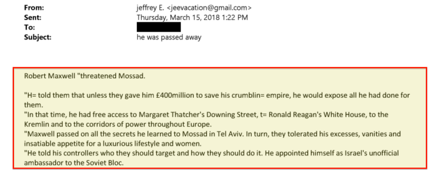 The timing is noteworthy. Epstein’s independent financial base was locked in at almost exactly the moment Robert Maxwell passed away. But the usual version of the story gets the sequence wrong. Epstein was already inside the Maxwell world in the 1980s, and had already been introduced to Ghislaine — all before the Wexner deal gave him his cover as a legitimate wealth manager.