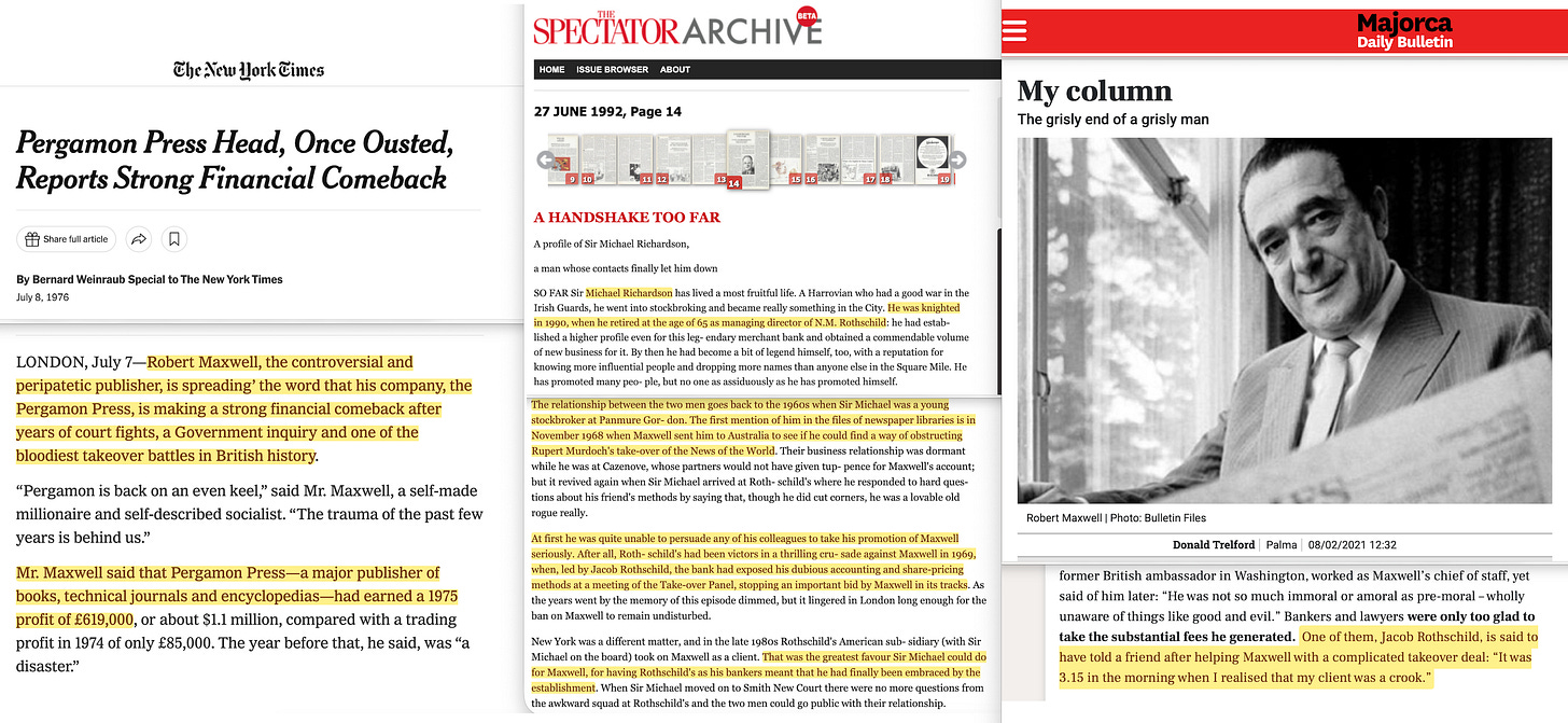 The turnaround was remarkable. Jacob Rothschild — the same man who had tried to destroy Maxwell’s control of Pergamon in 1969 — was by the late 1980s personally advising him on business deals57. Donald Trelford, former editor of The Observer, later recorded that Rothschild told a friend58: ‘It was 3.15 in the morning when I realised that my client was a crook‘.