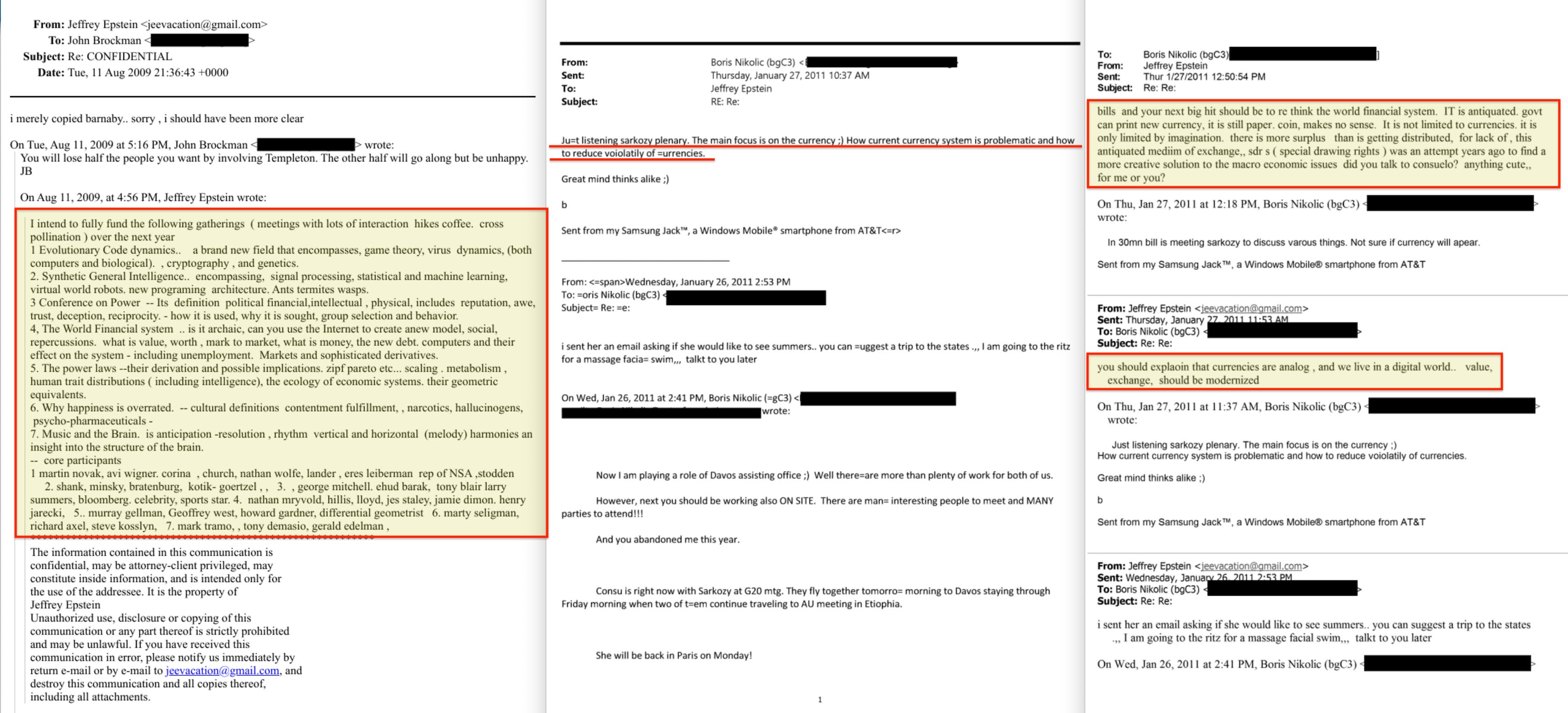 Two years later — as Nikolic texted him live from Sarkozy’s plenary at Davos on currency reform221222 — Epstein replied: ‘currencies are analog, and we live in a digital world. Value, exchange, should be modernized’223.