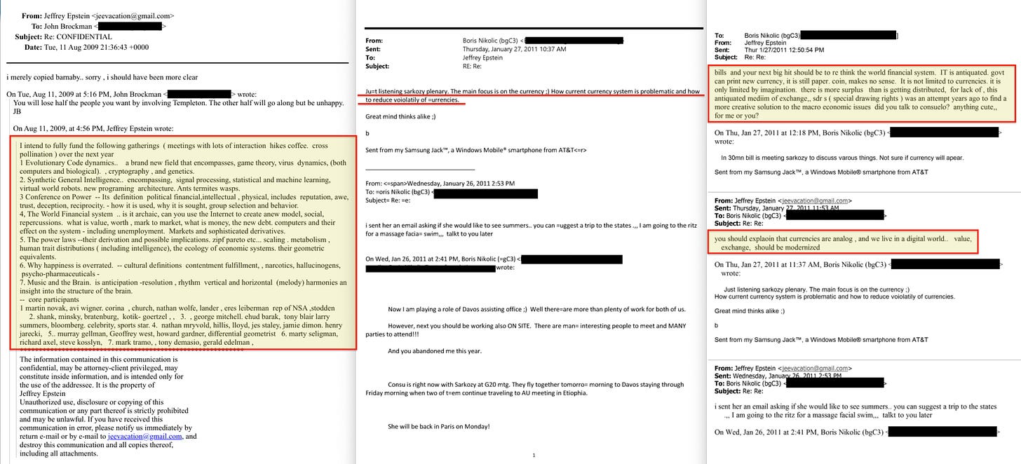 In August 2009, one month after leaving a Florida jail, Epstein wrote to his literary agent John Brockman laying out the programme in plain language220. He listed seven research topics he intended to fully fund over the coming year. They included ‘Synthetic General Intelligence’ — encompassing machine learning, signal processing, and new programming architecture. They included ‘Evolutionary Code Dynamics’ — encompassing cryptography, game theory, and genetics. They included a ‘Conference on Power’ — its definition across political, financial, intellectual, and physical domains, including ‘reputation, awe, trust, deception, reciprocity — how it is used, why it is sought, group selection and behavior’. And they included a direct question about whether the world financial system was archaic — whether the internet could be used to replace it with a new model, and what money actually is.