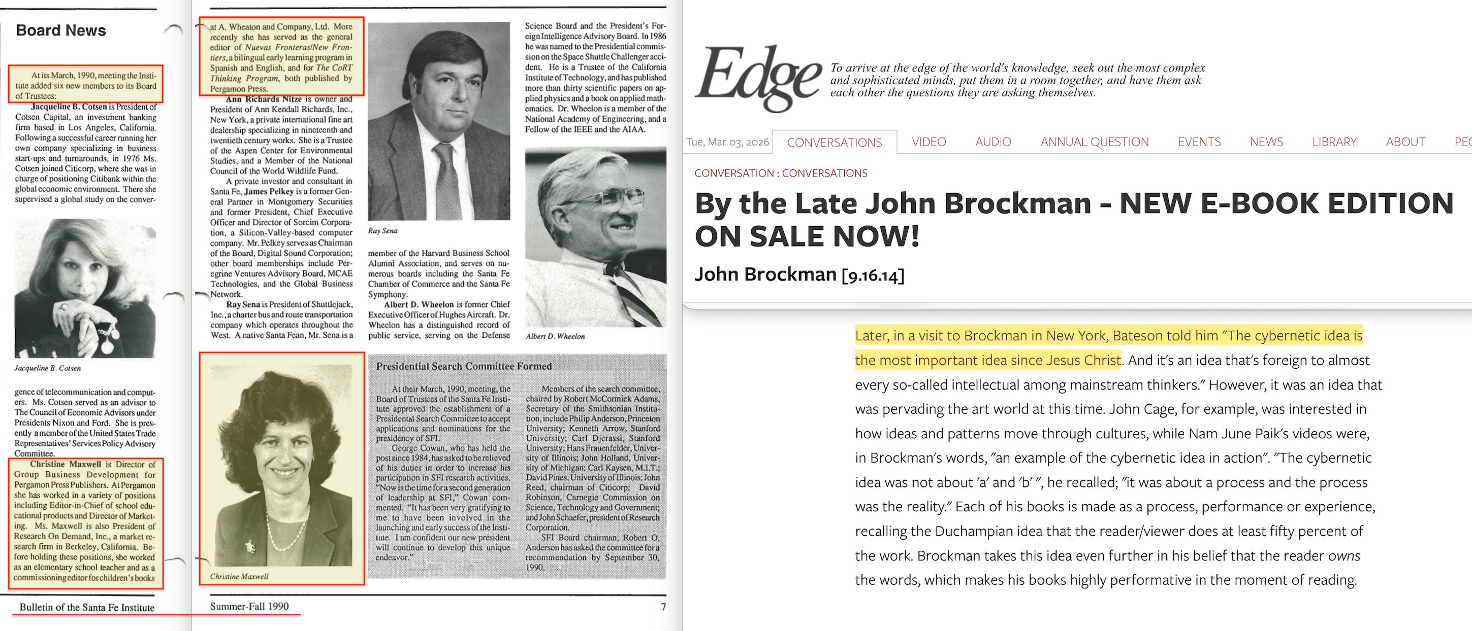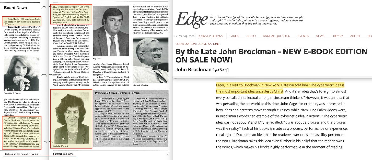 Brockman’s first three books were explicit responses to cybernetics36. Gregory Bateson, a core Macy member from 194637, told the Epstein-funded Brockman directly that cybernetics was ‘the most important idea since Jesus Christ’38.