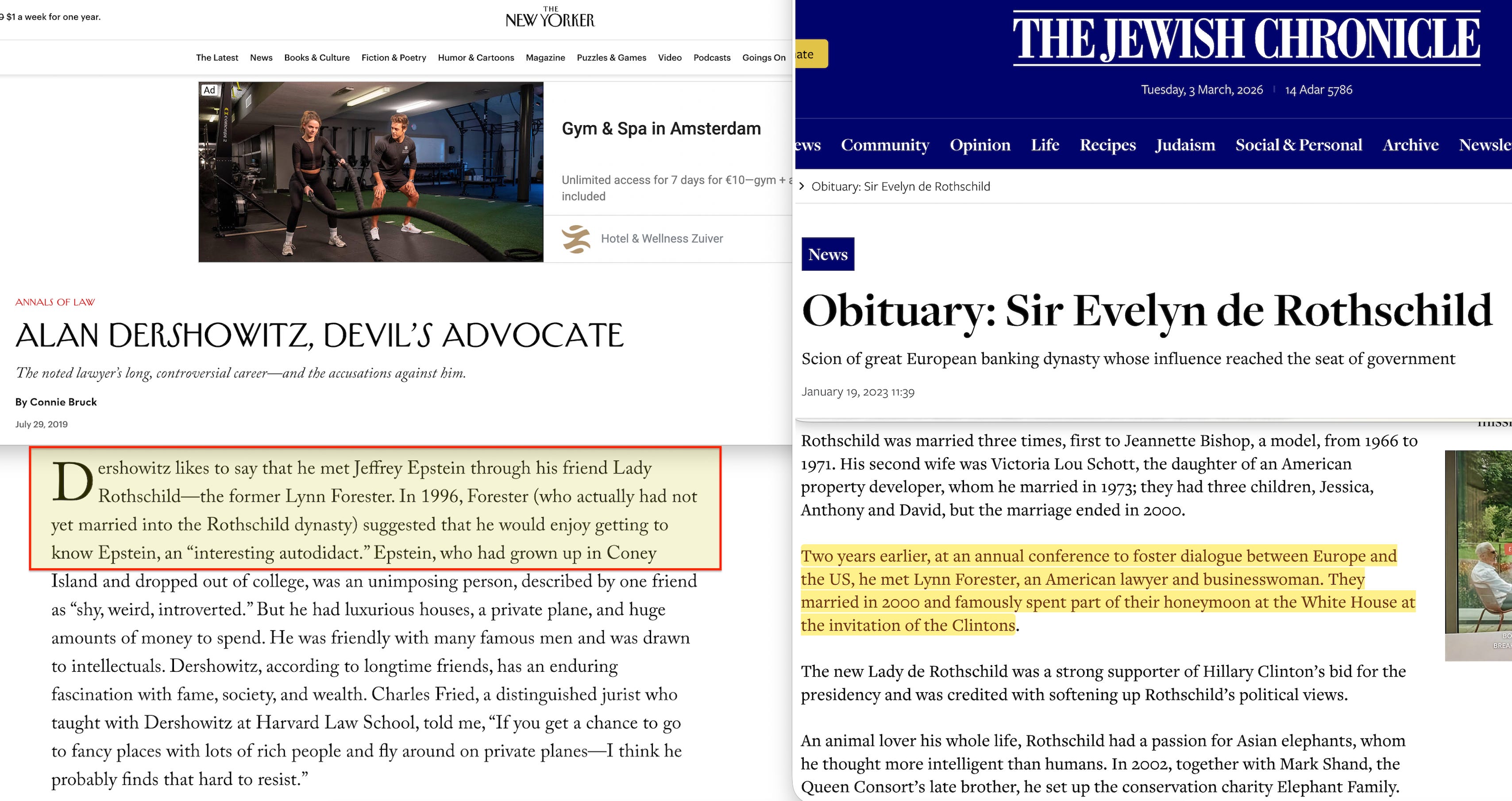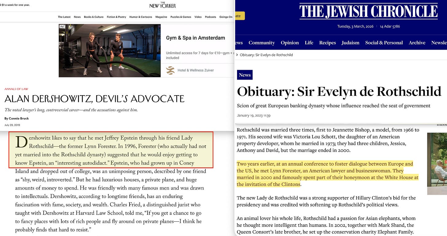 Forester flew on Epstein’s private jet five times between 1997 and 199883. According to Ghislaine Maxwell’s own DOJ testimony, it was Forester who introduced Epstein to Prince Andrew84. Alan Dershowitz has said that Forester introduced him to Epstein too, describing Epstein as an ‘interesting autodidact‘ — a self-taught intellectual85.