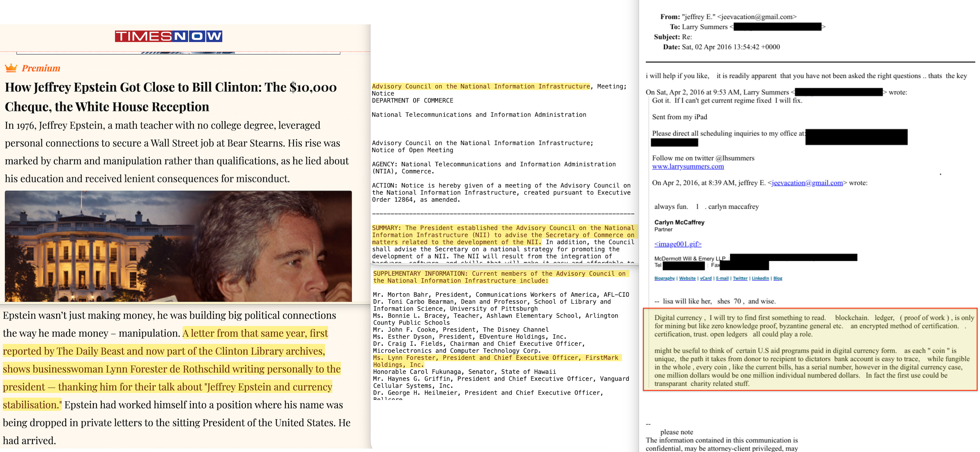 In other words, a presidential adviser on the future of digital money — Lynn Forester — was using her access to connect Epstein on the topic of currency stabilisation. This was twenty-one years before Epstein sent Lawrence Summers a detailed technical proposal for tokenised digital currency82.