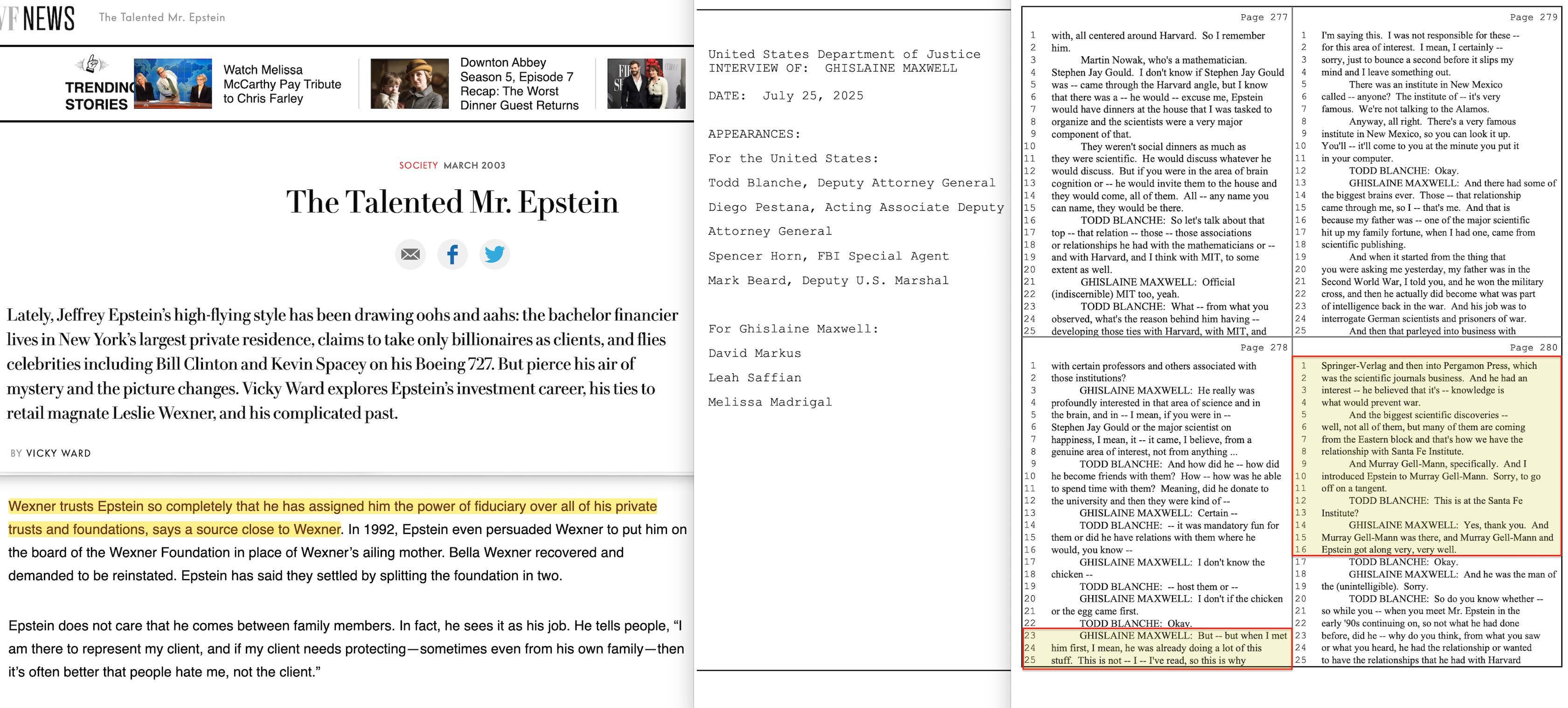 Maxwell had placed Epstein inside a network whose practical goals matched the ideas his publishing house had been putting into the world for forty years. As documented in Section I, Maxwell didn’t just publish the programme — he funded the institution where it was being applied to governance and economics, and installed his daughter Christine on its board. In her July 2025 DOJ interview98, Ghislaine confirmed that connections made through her father led to her introducing Epstein to the Santa Fe Institute and to Murray Gell-Mann specifically.