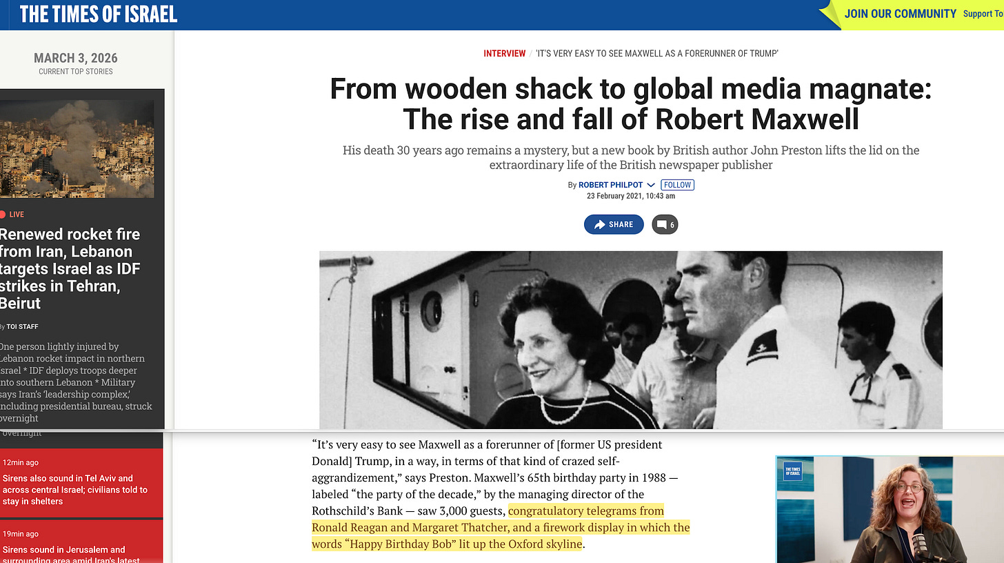 Robert Maxwell had personal access to Margaret Thatcher’s Downing Street, Ronald Reagan’s White House, and the Kremlin — all at the same time10. His biographers described him as ‘Israel’s unofficial ambassador to the Soviet Bloc‘11.
