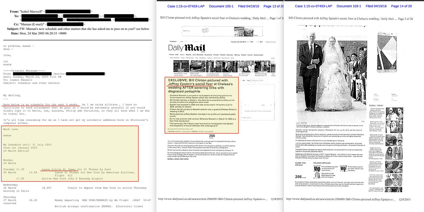 Maxwell built the lists of important social contacts. Epstein edited individual names on them. When Google co-founder Sergey Brin visited the Caribbean, it was Maxwell who told Epstein how to act: ‘be v nice to her not stupid — she is key‘. When the Governor of New Mexico needed a private jet, his office called Maxwell, not Epstein105. When Epstein was facing criminal charges, he asked Maxwell which offence he should plead guilty to — and she told him.