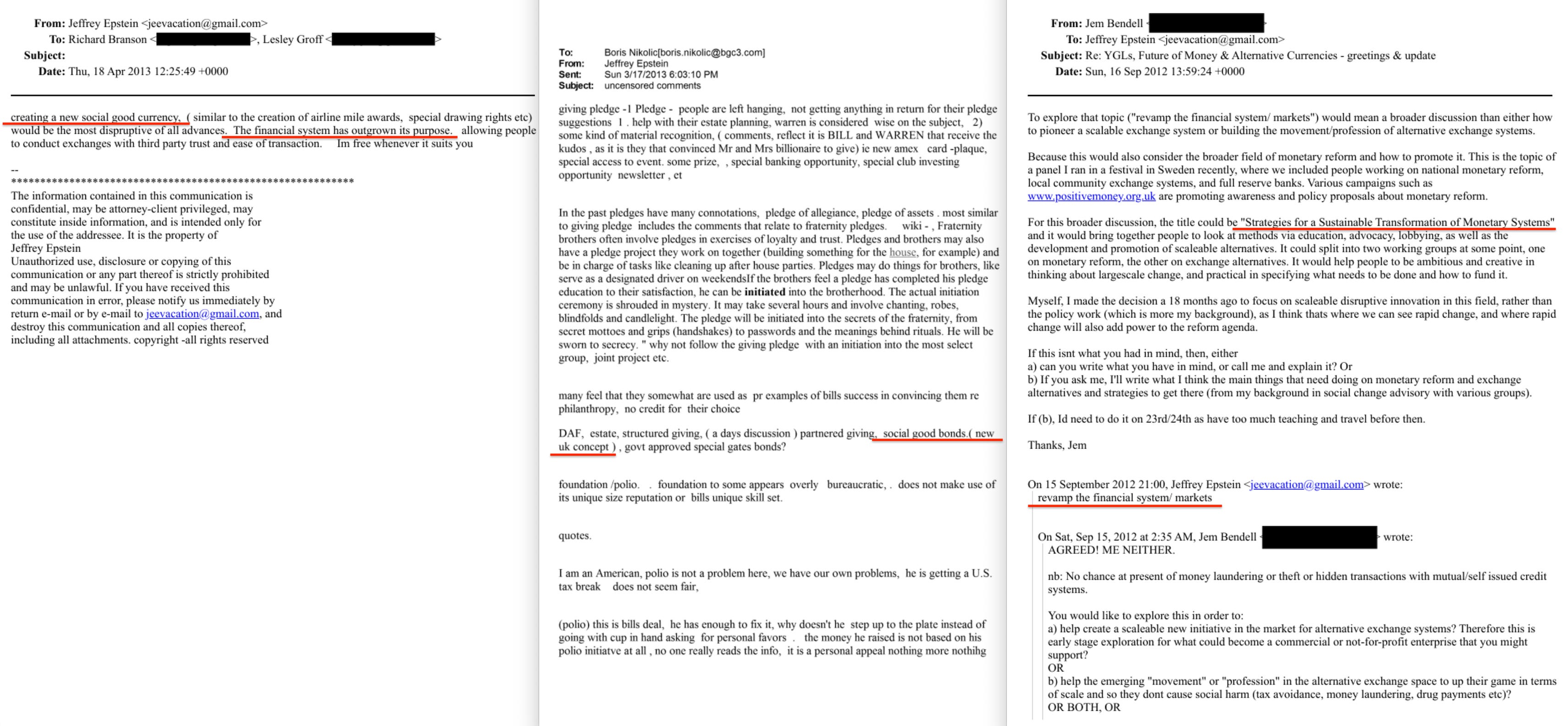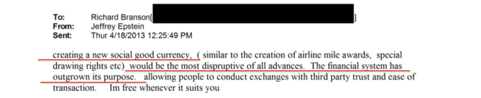 The solution was to stop stabilising analogue money and replace it with digital money. The rollout would begin where no one could object: governments and charities, which pay no tax and serve ‘the public good’. But the ambition was larger. In a pitch to Richard Branson, Epstein called it a ‘social good currency’ and described it as ‘the most disruptive of all advances’, adding: ‘the financial system has outgrown its purpose’228.
