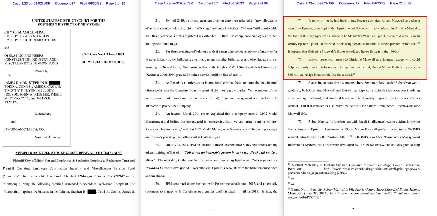 Epstein’s connection to the Maxwell family goes back much further than most people realise — as far as a decade before Robert Maxwell died. According to a verified shareholder complaint filed in federal court in New York in 2023, Maxwell introduced his daughter Ghislaine to Epstein in the 1980s94. This is confirmed separately by Steven Hoffenberg, who was Epstein’s business partner at Towers Financial Corporation, and who said that Robert Maxwell introduced the two of them in the late 1980s95.