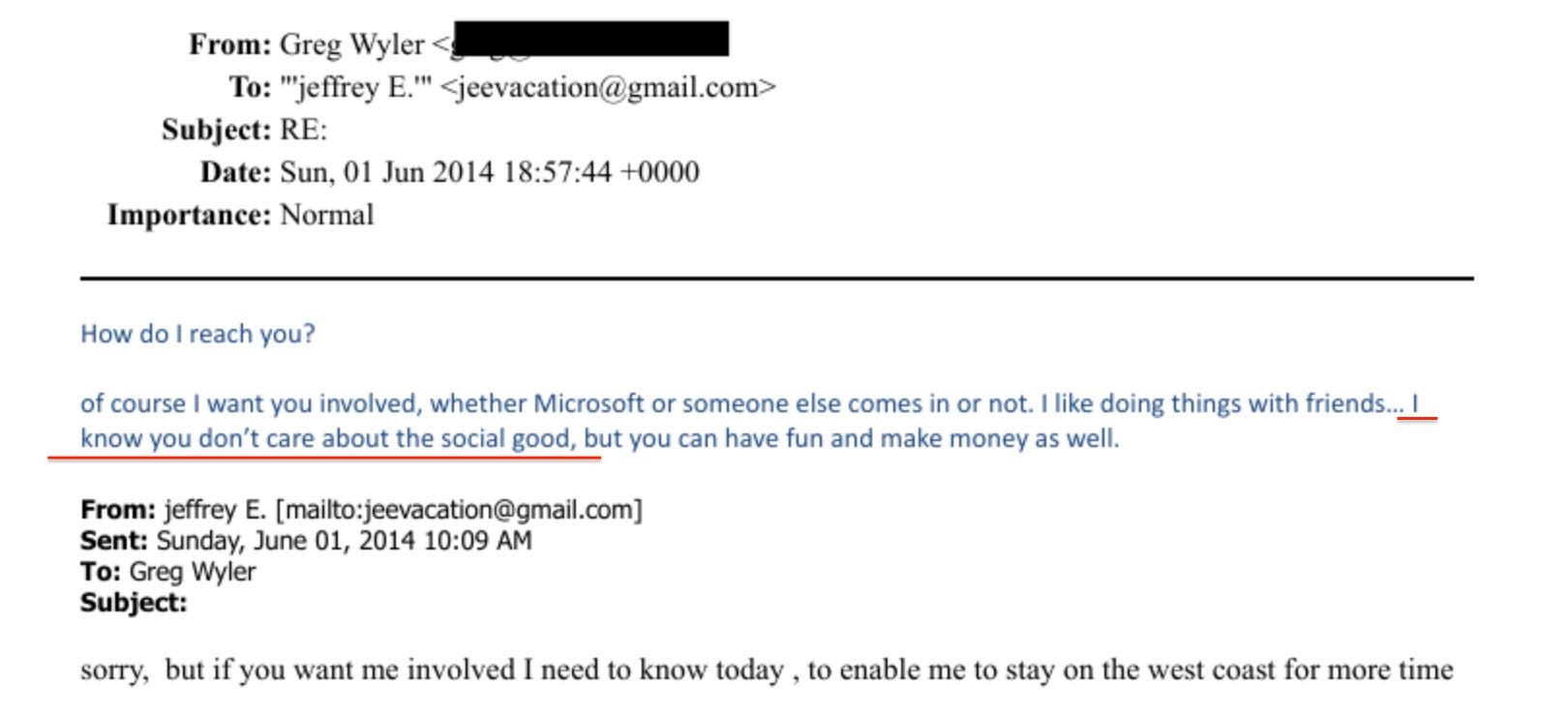The satellite entrepreneur Greg Wyler put it more plainly in a separate email229: 'I know you don't care about the social good'.