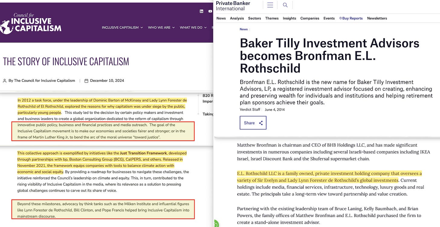 Forester went on to found the Council for Inclusive Capitalism, which later became the Council for Inclusive Capitalism with the Vatican90 — an organisation designed to embed social and environmental goals into how capital is allocated worldwide. She also co-founded the investment firm Bronfman E.L. Rothschild LP with Matthew Bronfman, the son of Edgar Bronfman91. This merged the Rothschild banking name with the Bronfman family, who had co-founded the Mega Group92 — a private network of billionaire donors whose members included Leslie Wexner, Ronald Lauder, and Michael Steinhardt93.