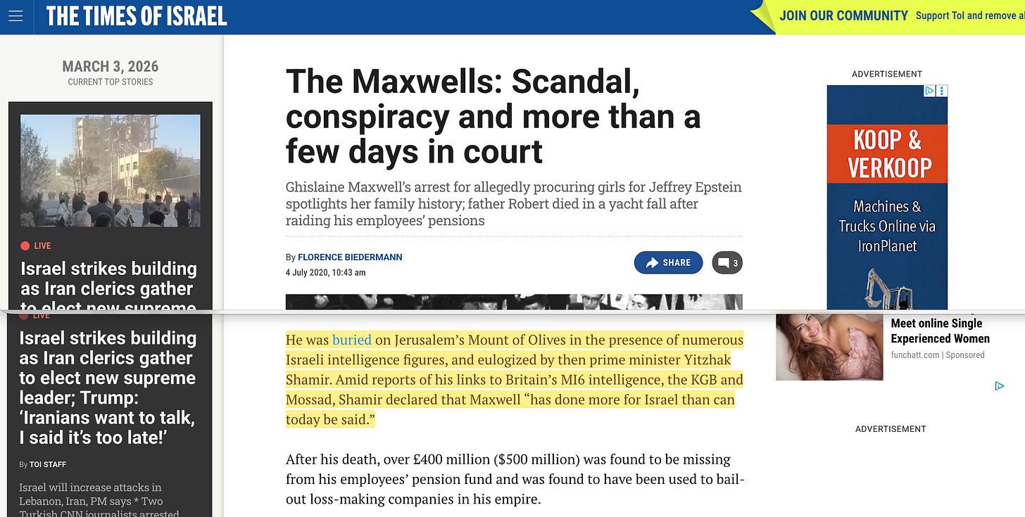 When he was buried in Jerusalem on 10 November 1991, six heads of Israeli intelligence — serving and former — attended the funeral3. The Israeli Prime Minister, Yitzhak Shamir, said something no one has fully explained: Maxwell ‘has done more for Israel than can today be said’4.