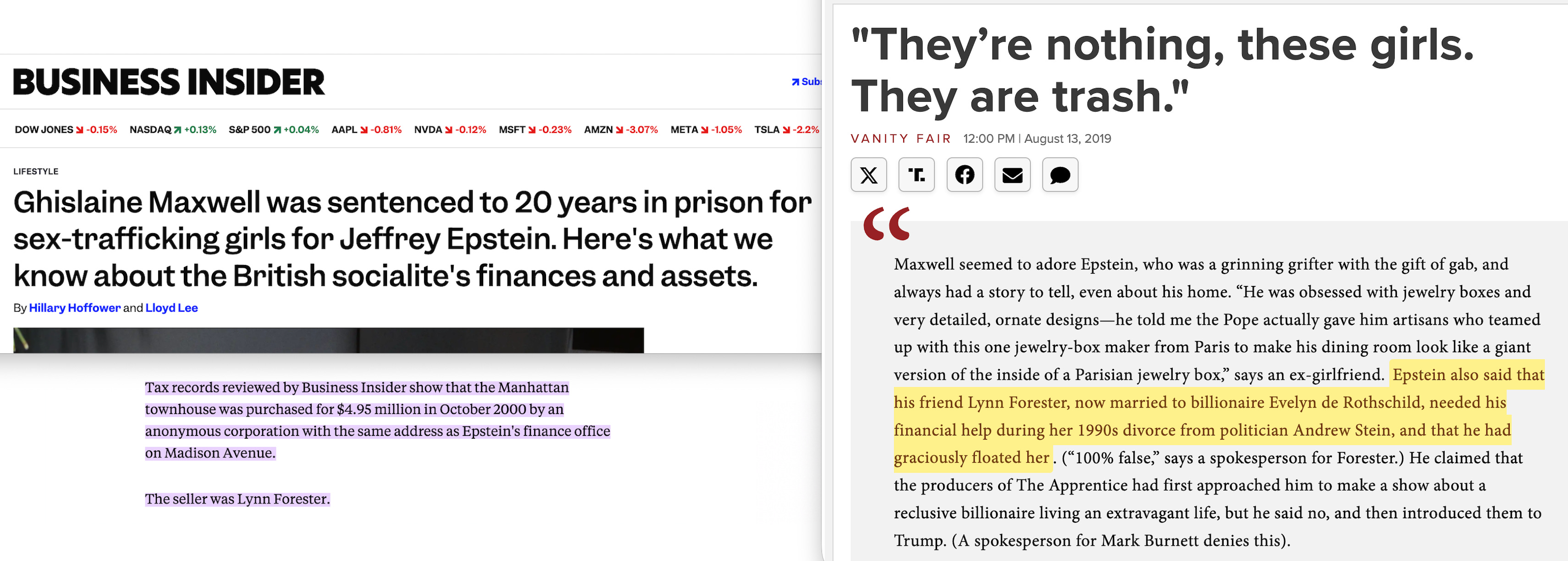 Property records show that Forester later sold a Manhattan townhouse she had bought for $4.475 million to an anonymous company registered at the same address as Epstein’s finance office7273. The sale price was roughly $8.5 million below what the property was worth. Ghislaine Maxwell lived in that townhouse until 2016.