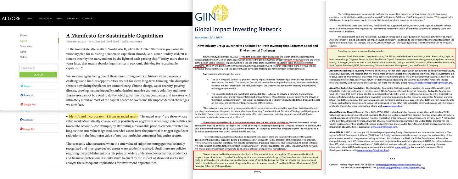 The same Gore who was heavily involved in developing the concept of ‘stranded assets’233, while the Clintons dealt with the political side of ‘impact investing’234.